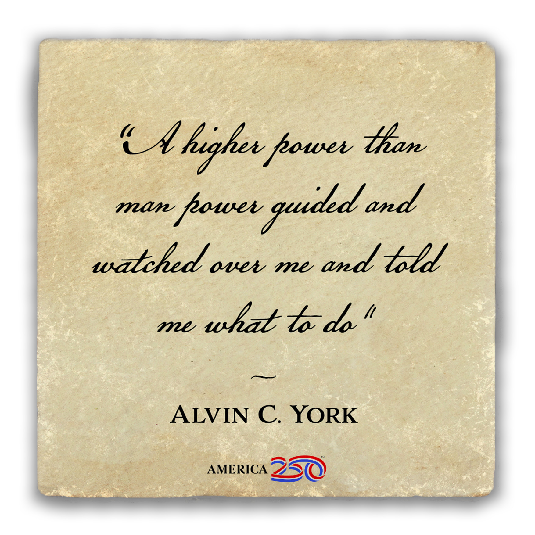 This tumbled stone coaster features the quote from Alvin C. York: "A higher power than manpower guided and watched over me and told me what to do". Save your counter from spills and stains with these patriotic-themed coasters, or buy some as a gift for a friend! Each coaster is 4 in. x 4 in. and stands 1/2 in. high. As these are cut from real rock, the white flecks and edging on each one will be unique. They are easy to clean, and come with a cork bottom to prevent slipping, and heat transfer. You can buy them in singles or packs of 4. ( COAST2-AM113 ) The AMERICA 250® word mark and logo are trademarks of the U.S. Semiquincentennial Commission and are used by Nelson Enterprises under license.