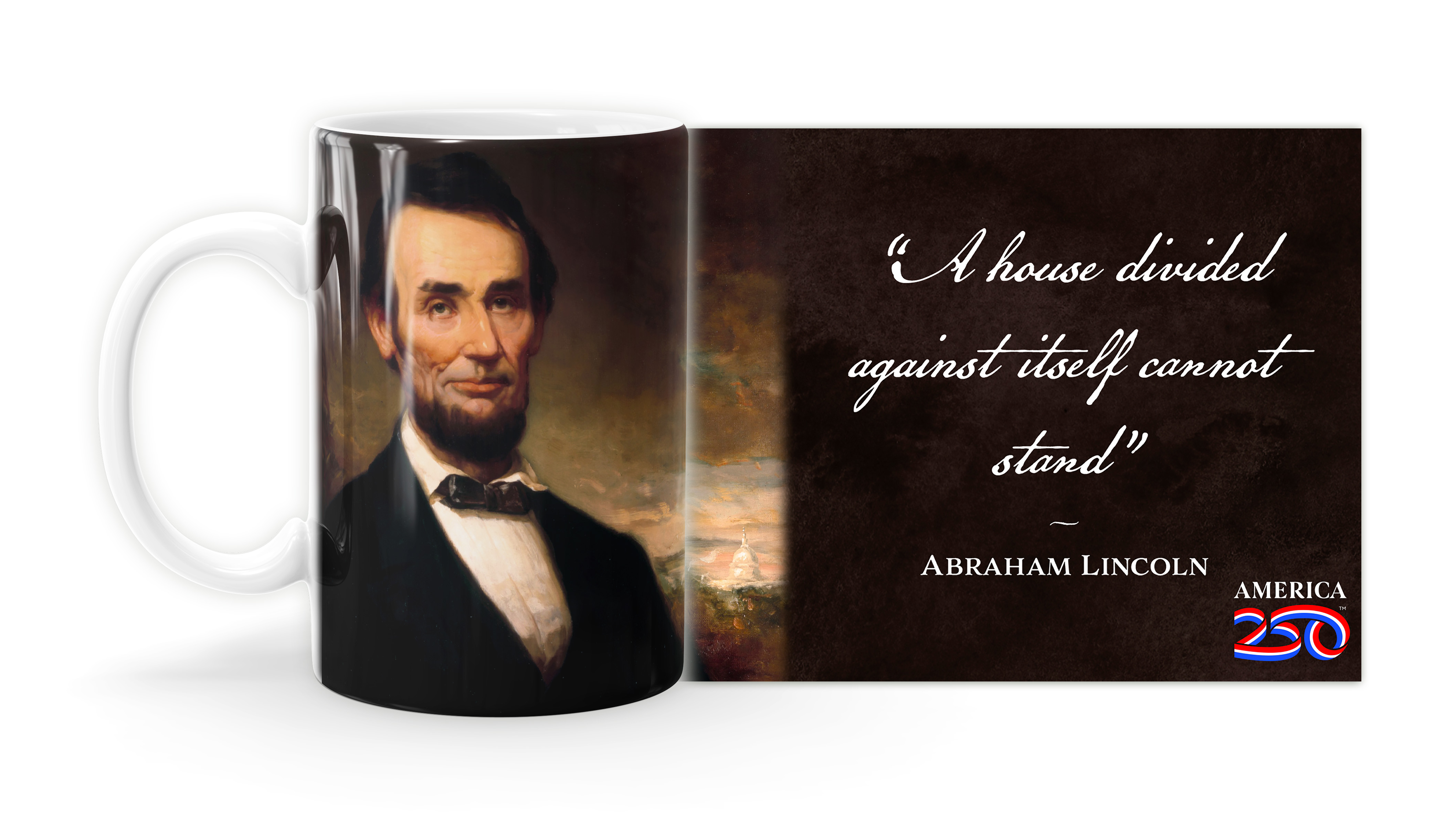 Enjoy your coffee, tea, and hot cocoa in this unique ceramic mug. This 15 oz. high quality coffee mug imprinted in our shops makes a great gift for any event or occasion! This mug features the Abraham Lincoln Quote “A house divided against itself cannot stand” ( MUG15X-AM10-81 ) The AMERICA 250® word mark and logo are trademarks of the U.S. Semiquincentennial Commission and are used by Nelson Enterprises under license.