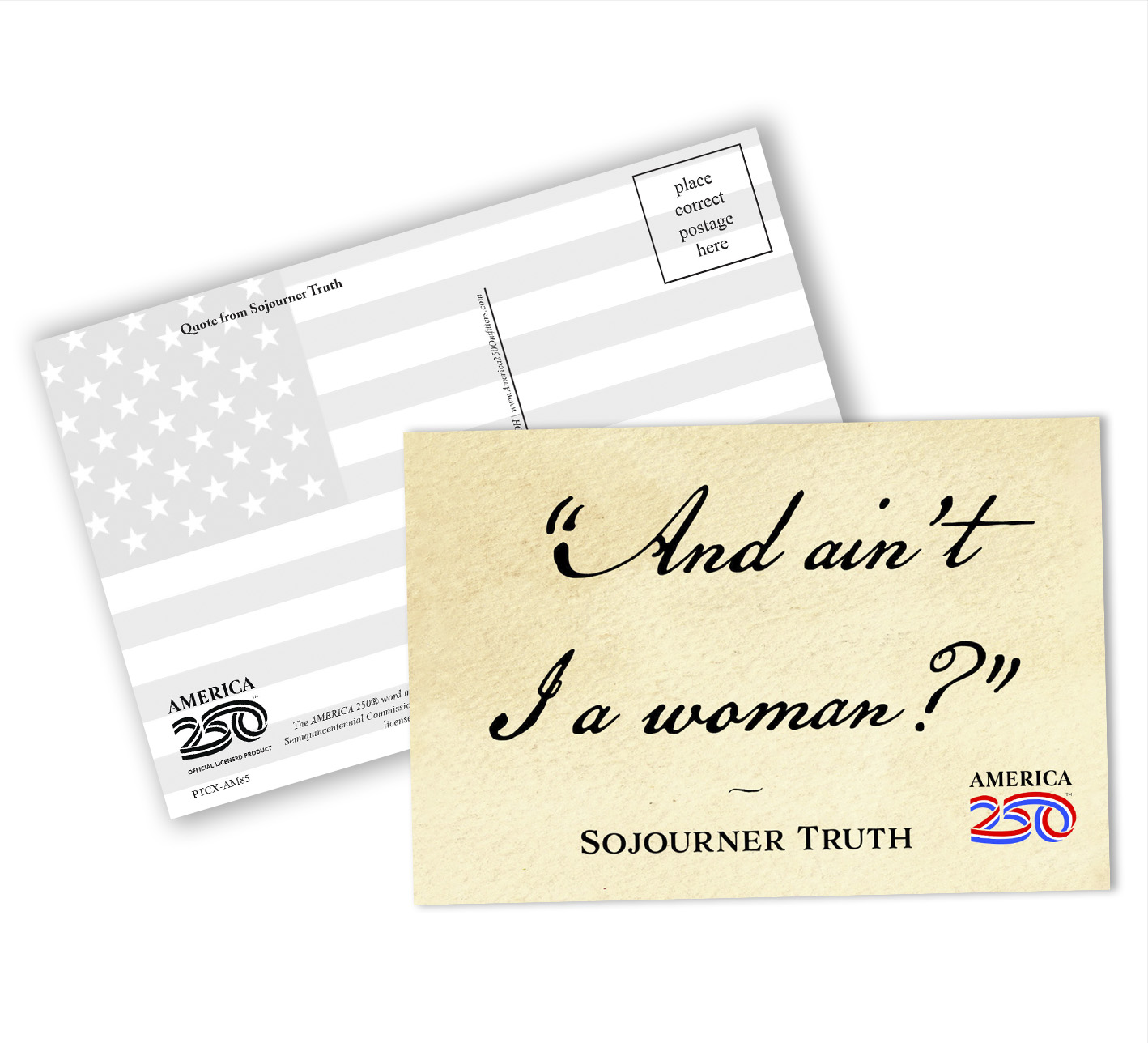 Send a message to friends and family with these Patriotic Postcards! The front features from Sojourner Truth: "And ain't I a woman?".  These postcards can be bought as singles, or in a bundle of a dozen.  ( PTC-AM85 ) The AMERICA 250® word mark and logo are trademarks of the U.S. Semiquincentennial Commission and are used by Nelson Enterprises under license.