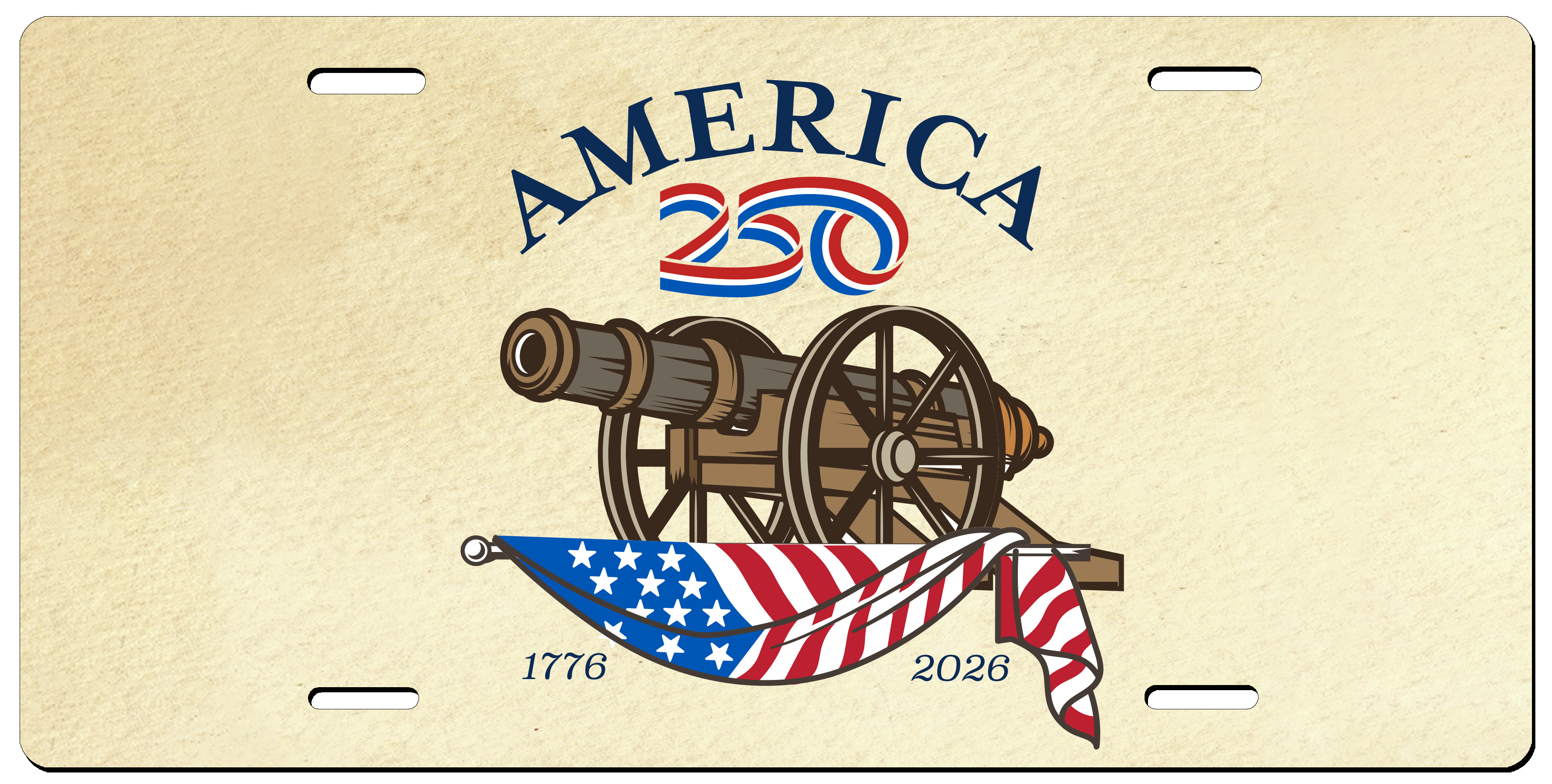 Take your patriotism to the streets, literally, with this unique, attractive license plate! Made in our shops, this high-quality, UV and weather resistant, 6"x12" glossy plate is the perfect addition to any vehicle and makes a wonderful gift! Celebrate America’s Semiquincentennial Anniversary (America’s 250th Birthday) with this commemorative design featuring the words America 250 and the American Flag draped beneath a cannon - a symbol of American freedom and the ability to defend against threats.