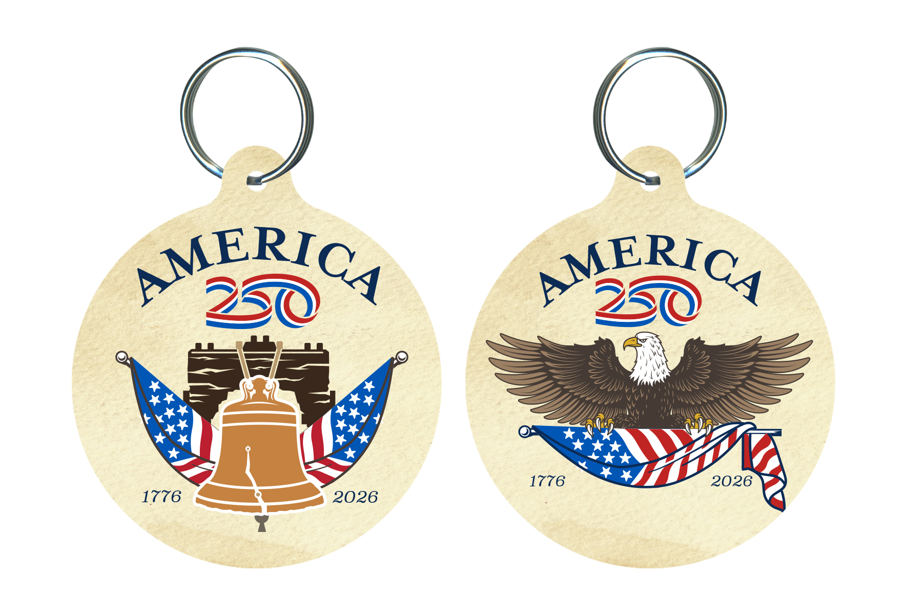 Proudly display your patriotism everywhere you go with this unique, round keychain! This high-quality, beautiful gift makes a great addition to your keychain and the perfect gift for the drivers in your circle of family and friends! Celebrate America’s Semiquincentennial Anniversary (America’s 250th Birthday) with this commemorative design featuring the words America 250 and the American Flag draped beneath the Liberty Bell - a symbol of American independence and equality.