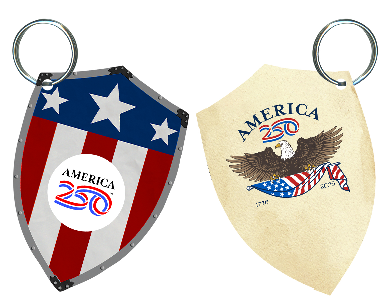 Proudly display your patriotism everywhere you go with this unique, glossy keychain! This high-quality, beautiful gift makes a great addition to your keychain and the perfect gift for the drivers in your circle of family and friends! This shield-shaped keychain features a stars and stripes pattern on one side, and a bald eagle with the America 250 logo on the other.