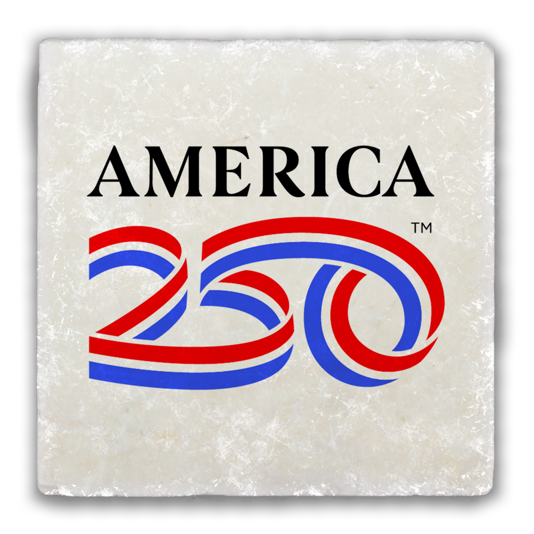 This tumbled stone coaster features the America 250 logo on a white background. Save your counter from spills and stains with these wine-themed coasters, or buy some as a gift for a friend! Each coaster is 4 in. x 4 in. and stands 1/2 in. high. As these are cut from real rock, the white flecks and edging on each one will be unique. They are easy to clean, and come with a cork bottom to prevent slipping, and heat transfer. You can buy them in singles or packs of 4.