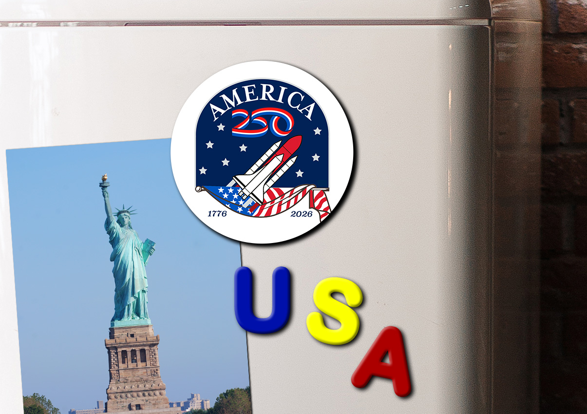 Show off your patriotism on your refrigerator, filing cabinet, or workspace with this glossy, durable magnet. This Magnet features an illustration of a rocket, with text that reads "America 250". ( MAGR-AM250A-ROCKET ) The AMERICA 250® word mark and logo are trademarks of the U.S. Semiquincentennial Commission and are used by Nelson Enterprises under license.