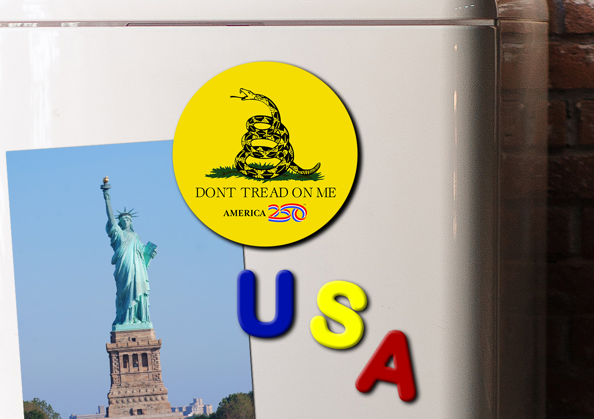 Show off your patriotism on your refrigerator, filing cabinet, or workspace with this glossy, durable magnet. This Magnet features the Gadsden Flag. ( MAGR-AM1 ) The AMERICA 250® word mark and logo are trademarks of the U.S. Semiquincentennial Commission and are used by Nelson Enterprises under license.