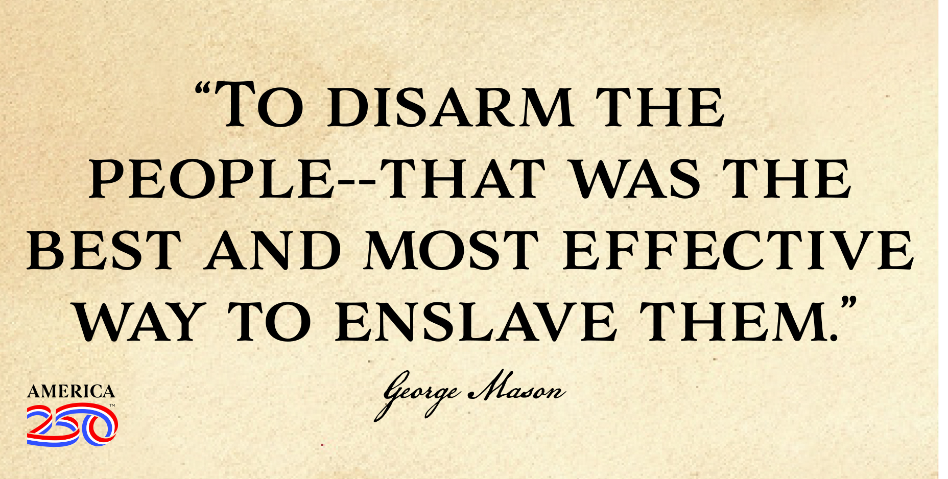 This bumper sticker features the George Mason Quote: “To disarm the people--that was the best and most effective way to enslave them." These removable, UV resistant, 3"x6" stickers will adhere to any flat clean surface and are by no means limited to cars! Perfect for windows, laptops, guitar cases, water bottles, and anything you want to add a patriotic flair to! The AMERICA 250® word mark and logo are trademarks of the U.S. Semiquincentennial Commission and are used by Nelson Enterprises under license.