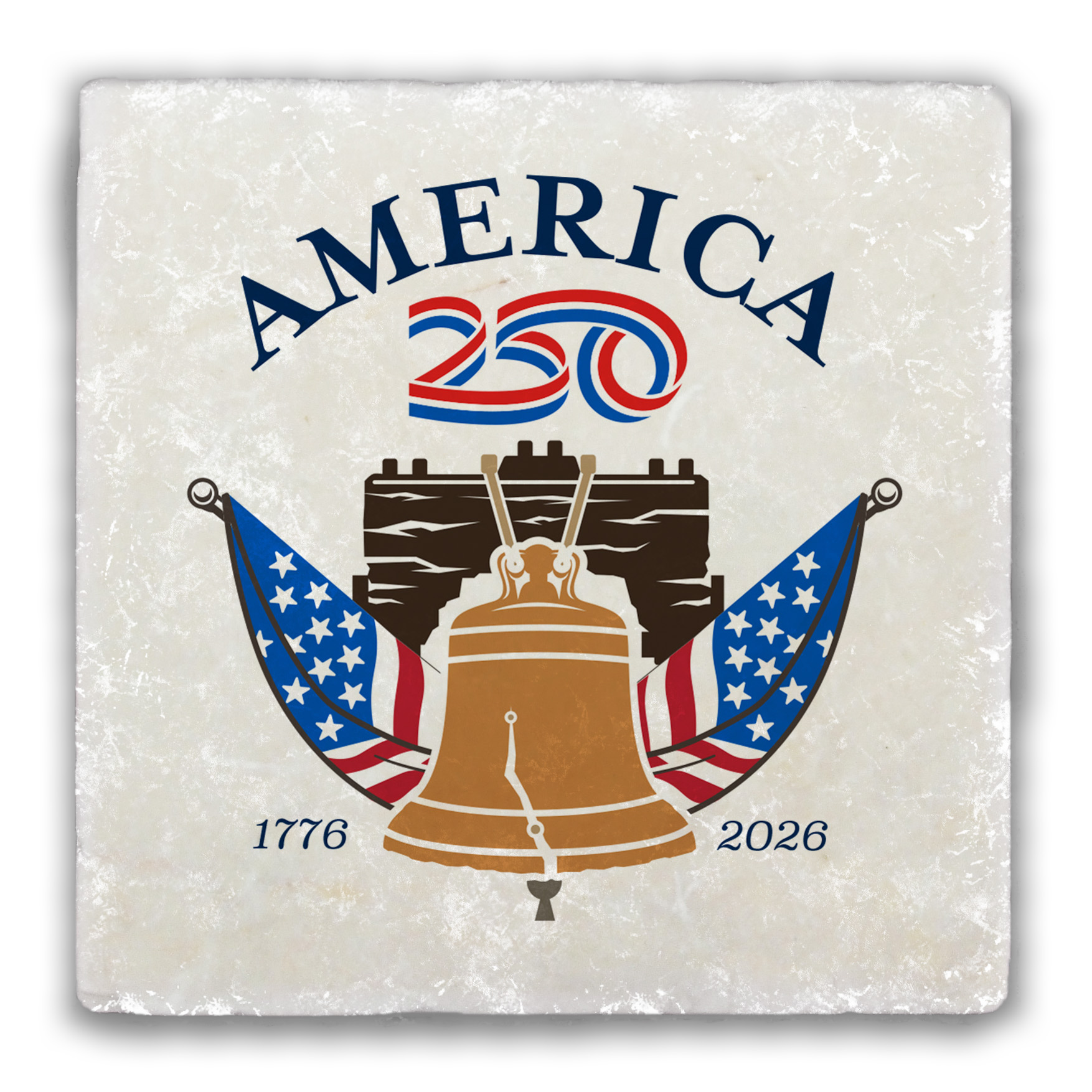 This tumbled stone coaster features an illustration of the Liberty Bell and an American flag with text that reads America 250. Save your counter from spills and stains with these patriotic coasters, or buy some as a gift for a friend! Each coaster is 4 in. x 4 in. and stands 1/2 in. high. As these are cut from real rock, the white flecks and edging on each one will be unique. They are easy to clean, and come with a cork bottom to prevent slipping, and heat transfer. You can buy them in singles or packs of 4. ( COAST2-AM250A-LIBERTYBELL ) The AMERICA 250® word mark and logo are trademarks of the U.S. Semiquincentennial Commission and are used by Nelson Enterprises under license.