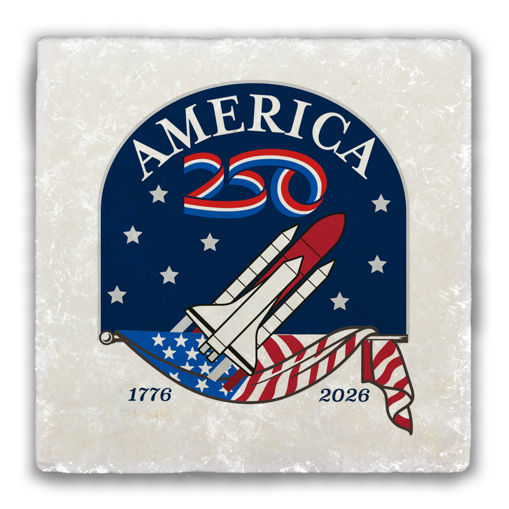This tumbled stone coaster features an illustration of a rocket ship and the American flag, with text that reads "America 250." Save your counter from spills and stains with these patriotic coasters, or buy some as a gift for a friend! Each coaster is 4 in. x 4 in. and stands 1/2 in. high. As these are cut from real rock, the white flecks and edging on each one will be unique. They are easy to clean, and come with a cork bottom to prevent slipping, and heat transfer. You can buy them in singles or packs of 4. ( COAST2-AM250A-ROCKET ) The AMERICA 250® word mark and logo are trademarks of the U.S. Semiquincentennial Commission and are used by Nelson Enterprises under license.