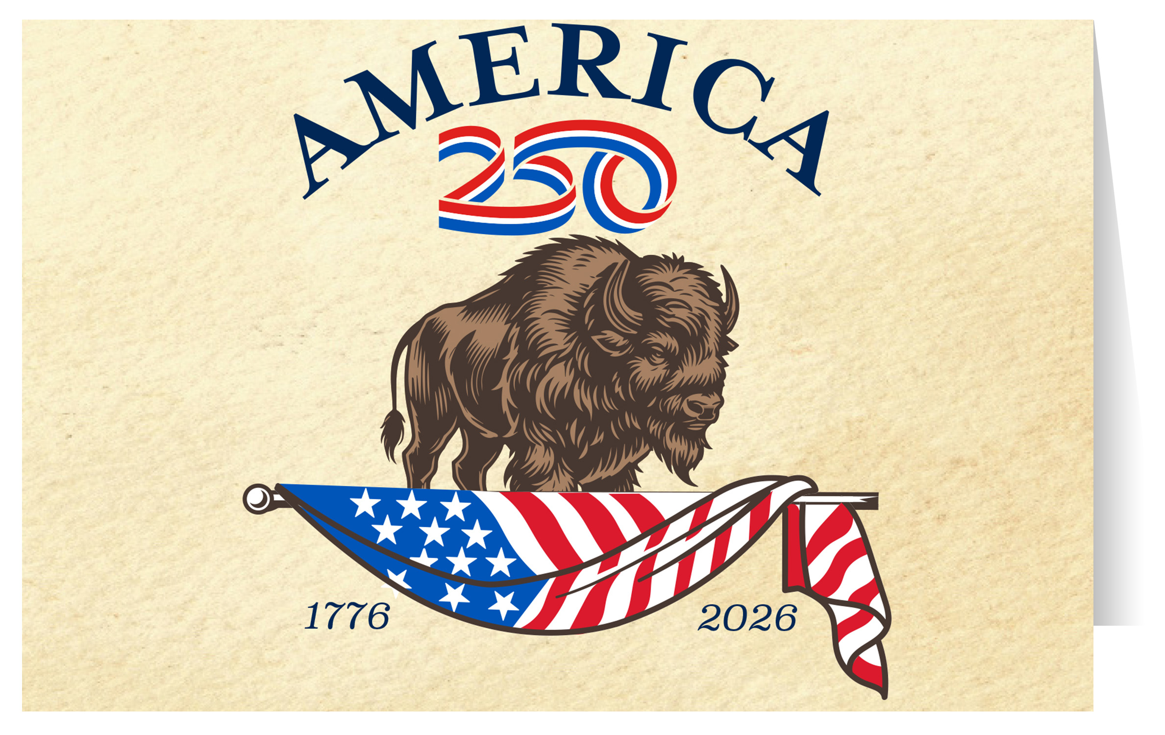 Send thanks, congratulations, greetings, and more to friends and family with these Patriotic Greeting Cards! The front features an illustration of a buffalo and the American flag, with text that reads "America 250.". The inside is blank. Printed on heavy cardstock, this 4.25"x5.5" card comes with envelopes, and can be bought individually or in bundles of 6. ( STC-AM24 ) The AMERICA 250® word mark and logo are trademarks of the U.S. Semiquincentennial Commission and are used by Nelson Enterprises under license.
