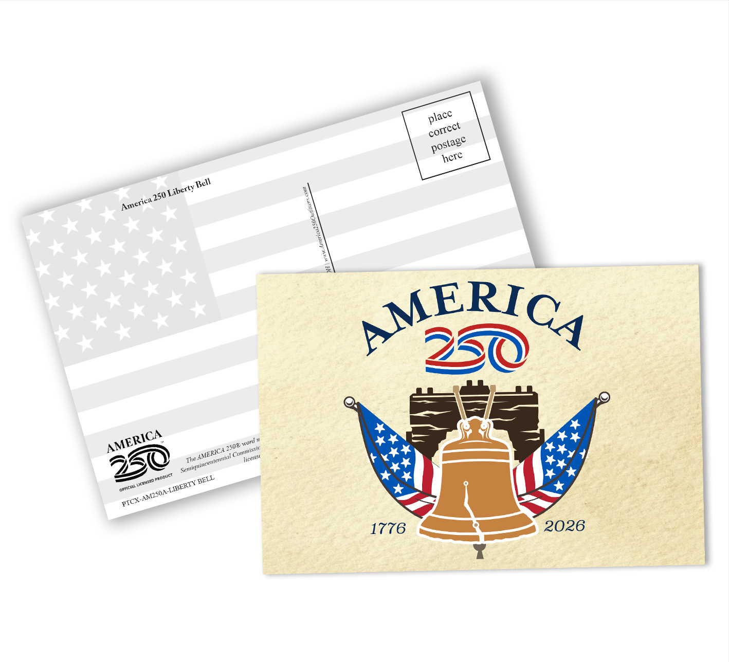 Send a message to friends and family with these Patriotic Postcards! The front features an illustration of the Liberty Bell and text that reads "America 250." These postcards can be bought as singles, or in a bundle of a dozen. ( PTC-AM250LIBERTYBELL ) The AMERICA 250® word mark and logo are trademarks of the U.S. Semiquincentennial Commission and are used by Nelson Enterprises under license.