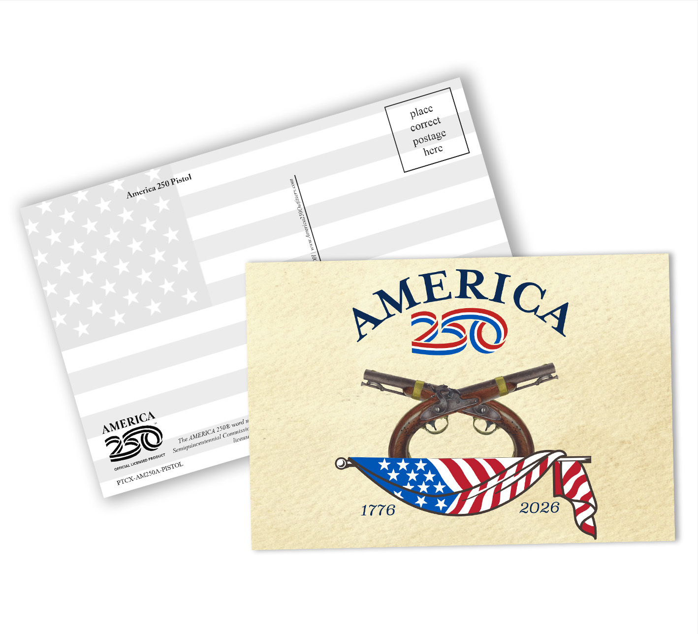 Send a message to friends and family with these Patriotic Postcards! The front features an illustration of crossed pistols and the American flag, with text that reads "America 250." These postcards can be bought as singles, or in a bundle of a dozen. ( PTC-AM250A PISTOL ) The AMERICA 250® word mark and logo are trademarks of the U.S. Semiquincentennial Commission and are used by Nelson Enterprises under license.