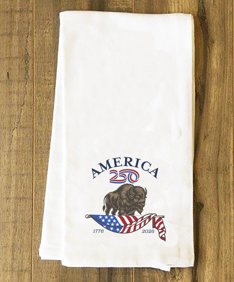 Clean and beautify the home with these tea towels! Celebrate America’s Semiquincentennial Anniversary (America’s 250th Birthday) with this commemorative design featuring the words America 250 and the American Flag draped beneath a buffalo - a symbol of American strength and the wild west. These 28" x 29" flour sack towels are 100% cotton, making them lint free, highly absorbent, quick drying, shrink resistant and extremely versatile. They're excellent for wiping up water, drying dishes, and lining baskets full of cookies, and much more. All towels are machine washable, bleed-resistant, and printed in Steubenville, OH.