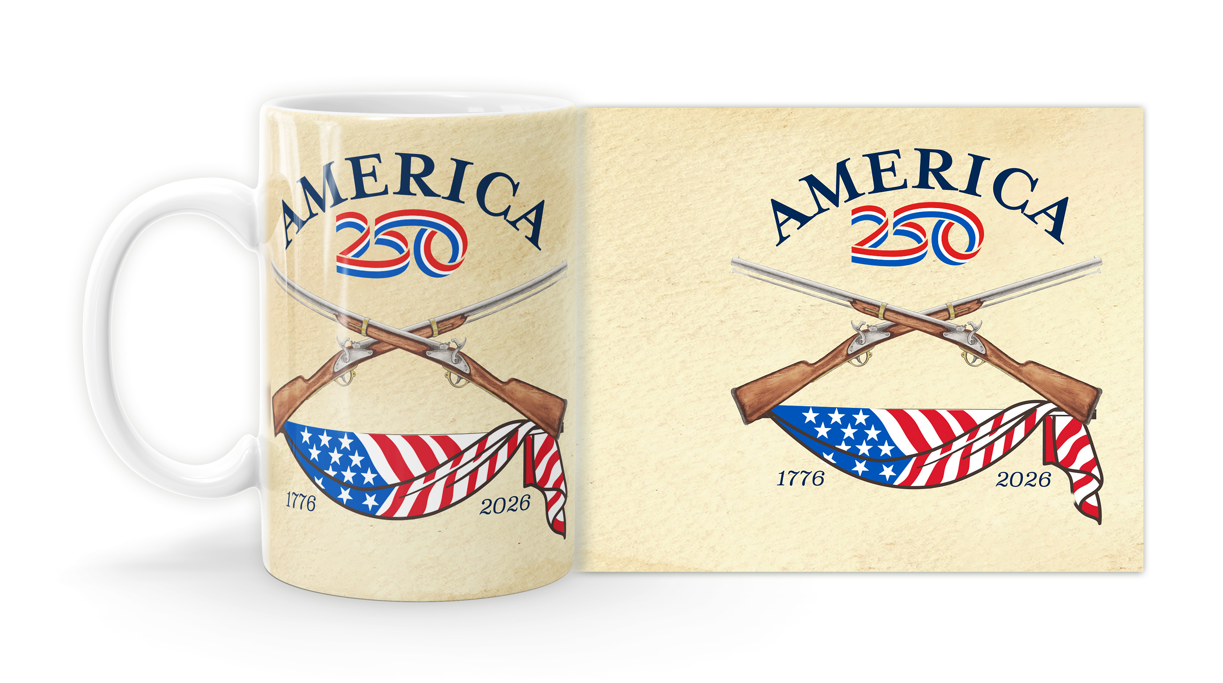 Enjoy your coffee, tea, and hot cocoa in this unique ceramic mug. This 15 oz. high quality coffee mug imprinted in our shops makes a great gift for any event or occasion! Celebrate America’s Semiquincentennial Anniversary (America’s 250th Birthday) with this commemorative design featuring the words America 250 and the American Flag draped beneath crossed flint lock rifles. Similar flint locks are used today for hunting and are remembered for their aid in multiple wars for American freedom.