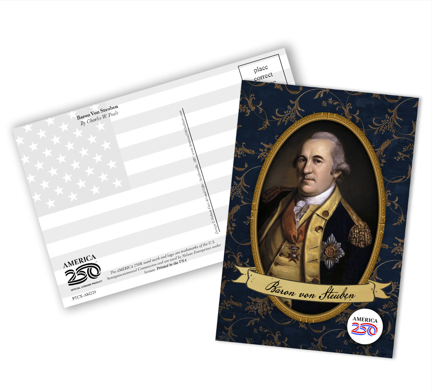 Send a message to friends and family with these Patriotic Postcards! The front features a painting of Baron von Steuben by Charles W. Peale. These postcards can be bought as singles, or in a bundle of a dozen. ( PTC-AM229 ) The AMERICA 250® word mark and logo are trademarks of the U.S. Semiquincentennial Commission and are used by Nelson Enterprises under license.