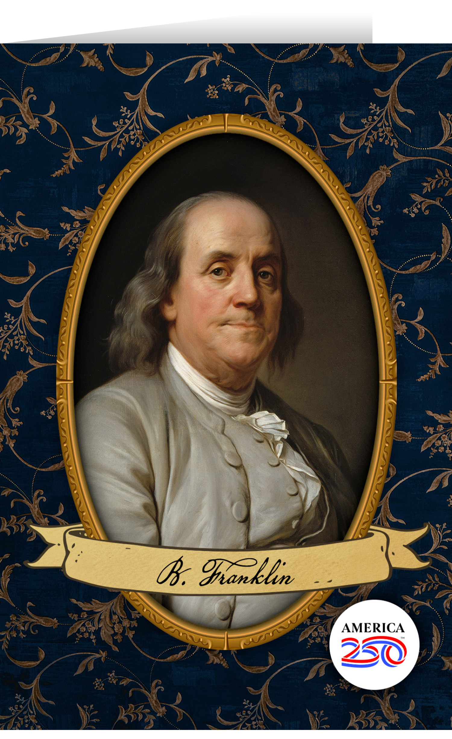 Send thanks, congratulations, greetings, and more to friends and family with these Patriotic greeting cards! The front features various a portrait of Benjamin Franklin by Joseph S. Duplessis. The inside is blank. Printed on heavy cardstock, this 4.25"x5.5" card comes with envelopes, and can be bought individually or in bundles of 6.  ( STC-QFRANKLIN ) The AMERICA 250® word mark and logo are trademarks of the U.S. Semiquincentennial Commission and are used by Nelson Enterprises under license.