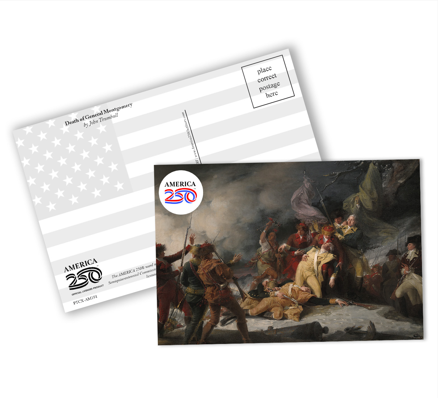 Send a message to friends and family with these Patriotic Postcards! The front features the painting "The Death of General Montgomery" by John Trumbull. These postcards can be bought as singles, or in a bundle of a dozen. ( PTC-AM191) The AMERICA 250® word mark and logo are trademarks of the U.S. Semiquincentennial Commission and are used by Nelson Enterprises under license.