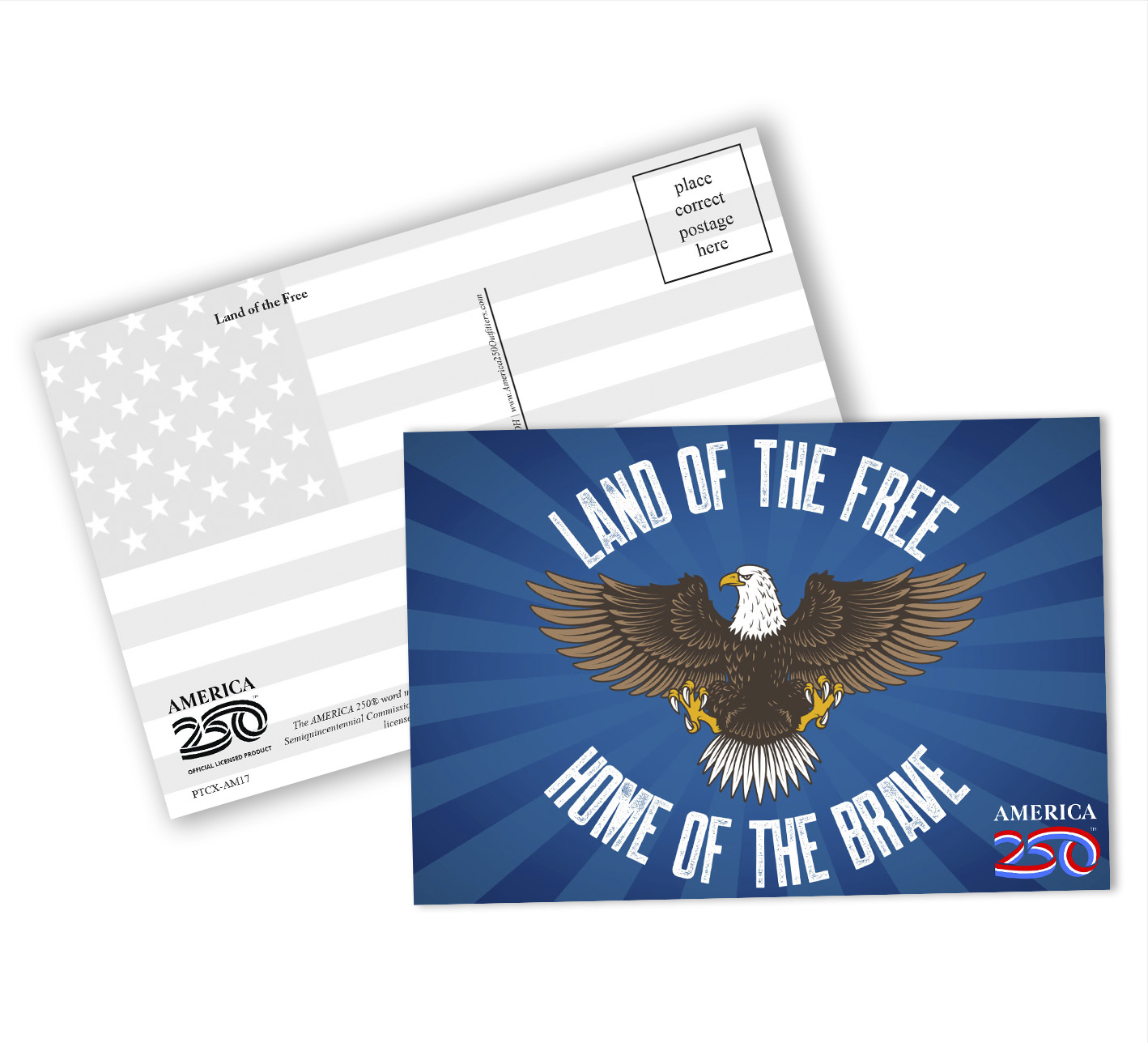 Send a message to friends and family with these Patriotic Postcards! The front features a bald eagle and text that reads "Land of the Free, Home of the Brave" around it.  These postcards can be bought as singles, or in a bundle of a dozen.  ( PTC-AM17 ) The AMERICA 250® word mark and logo are trademarks of the U.S. Semiquincentennial Commission and are used by Nelson Enterprises under license.