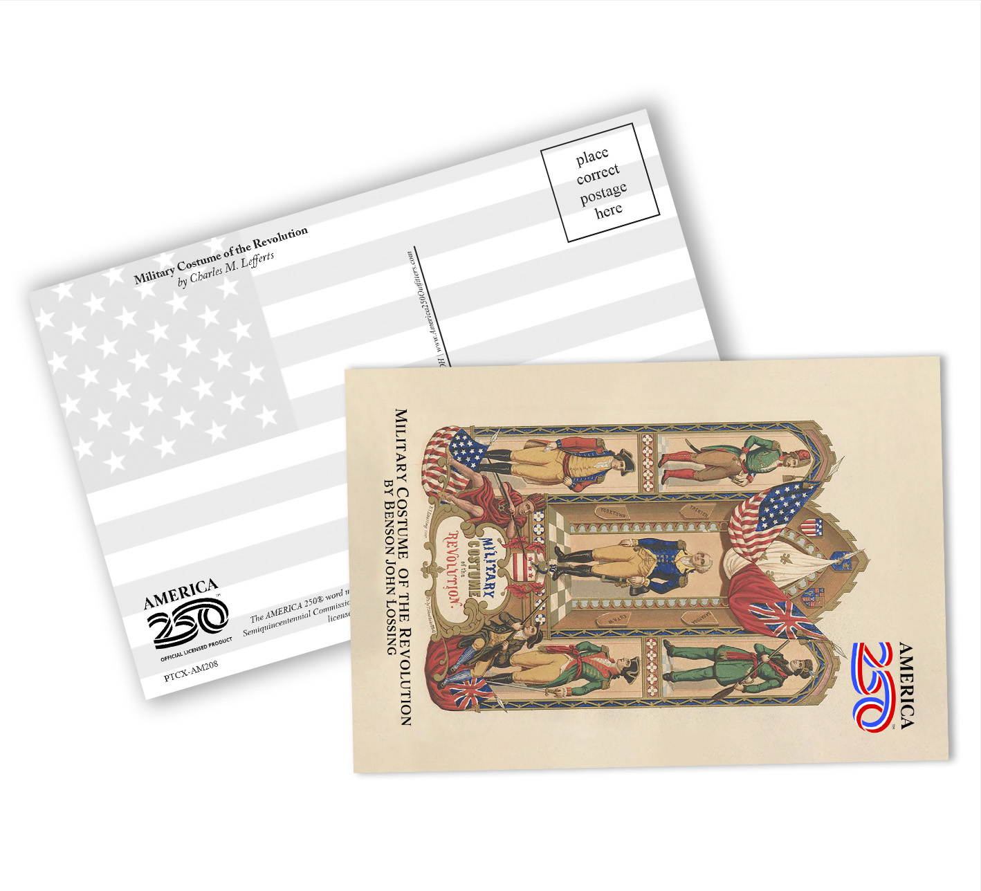 Send a message to friends and family with these Patriotic Postcards! The front features the illustration "Military Costume of the Revolution" by Charles M. Lefferts.  These postcards can be bought as singles, or in a bundle of a dozen.  ( PTC-AM208 ) The AMERICA 250® word mark and logo are trademarks of the U.S. Semiquincentennial Commission and are used by Nelson Enterprises under license.