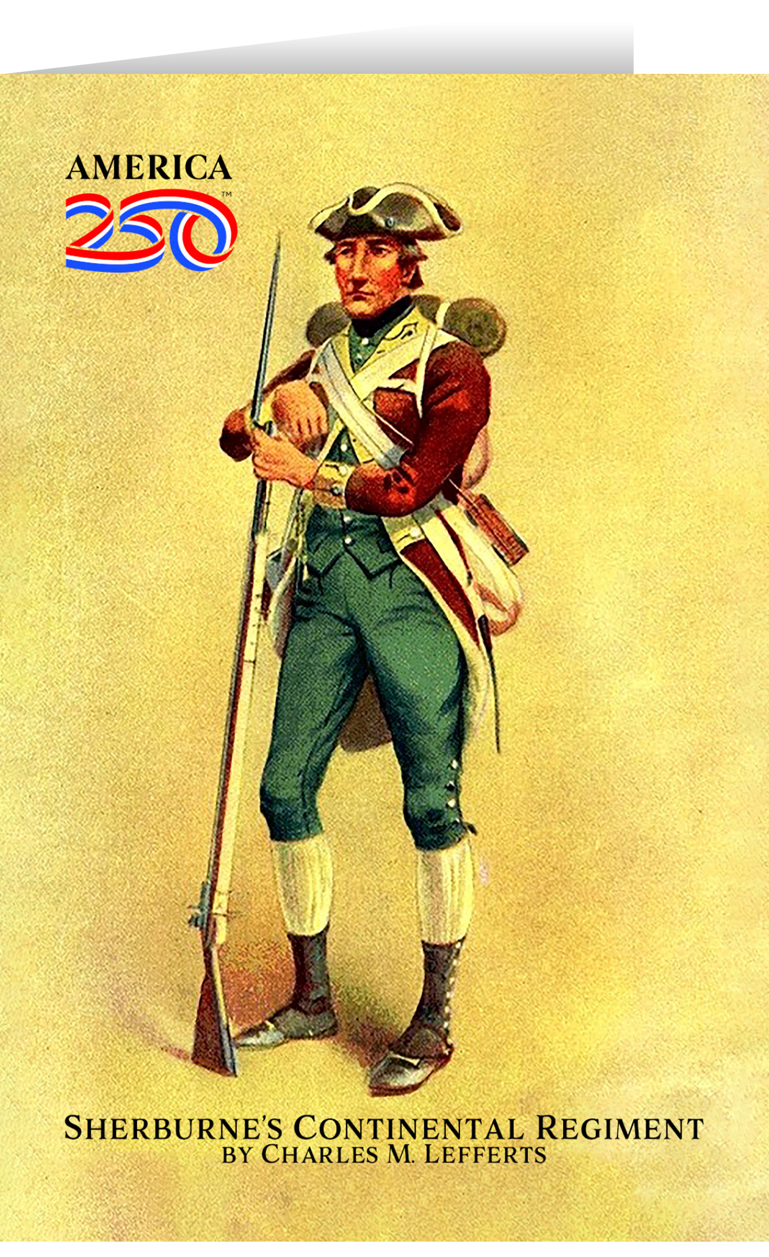 Send thanks, congratulations, greetings, and more to friends and family with these Patriotic greeting cards! The front features the illustration "Sherburne's Continental Regiment" by Charles M. Lefferts. The inside is blank. Printed on heavy cardstock, this 4.25"x5.5" card comes with envelopes, and can be bought individually or in bundles of 6.  ( STC-AM219 ) The AMERICA 250® word mark and logo are trademarks of the U.S. Semiquincentennial Commission and are used by Nelson Enterprises under license.