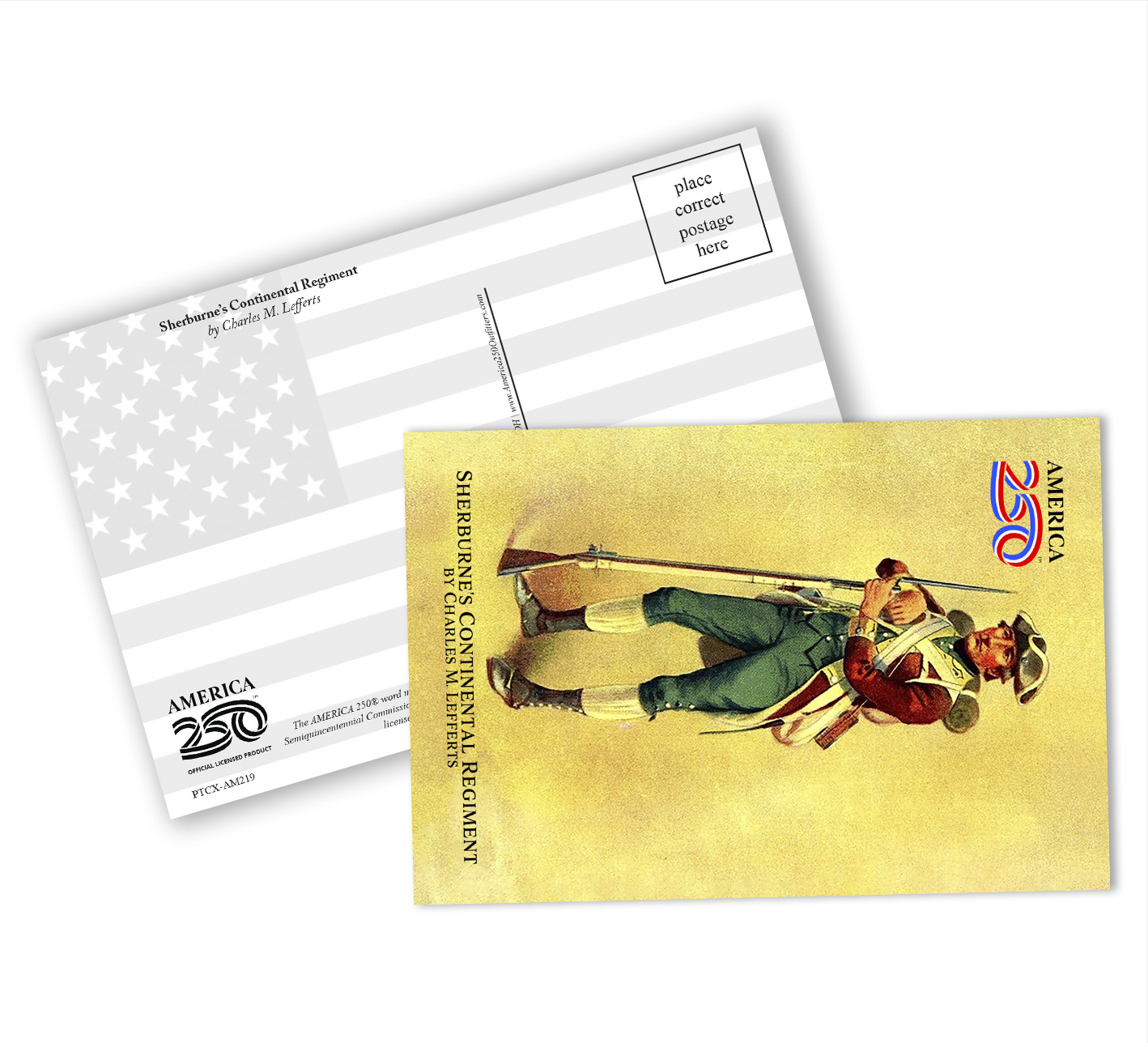 Send a message to friends and family with these Patriotic Postcards! The front features the illustration "Sherburne's Continental Regiment" by Charles M. Lefferts. These postcards can be bought as singles, or in a bundle of a dozen. ( PTC-AM219 ) The AMERICA 250® word mark and logo are trademarks of the U.S. Semiquincentennial Commission and are used by Nelson Enterprises under license.