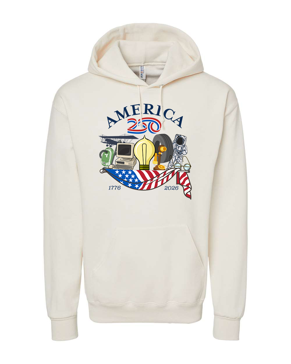 Celebrate America’s Semiquincentennial Anniversary (America’s 250th Birthday) with this commemorative design featuring the words America 250 and the American Flag draped beneath inventions - a symbol of American success and development.