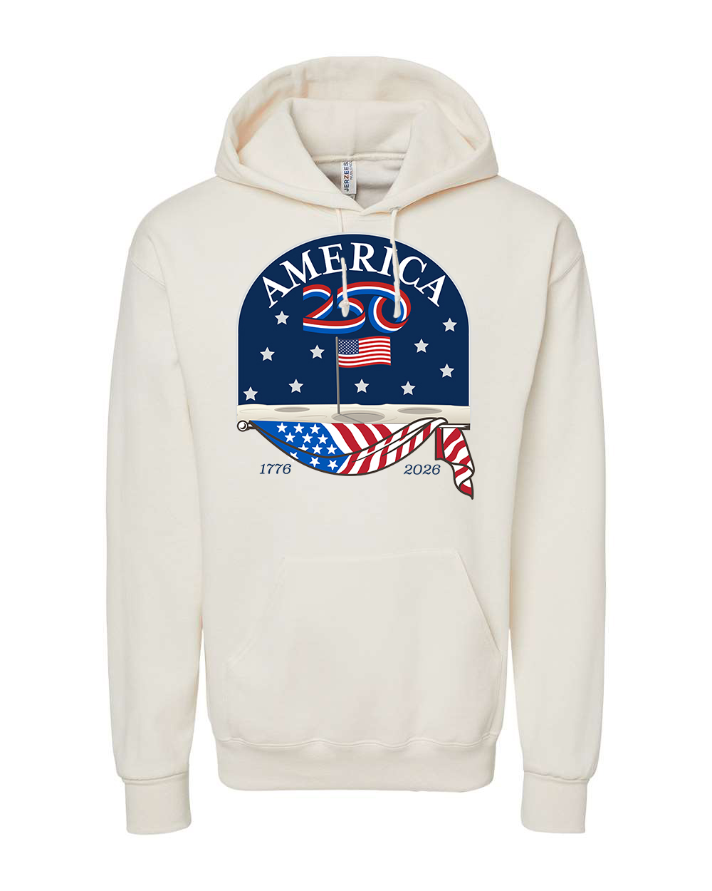 Celebrate America’s Semiquincentennial Anniversary (America’s 250th Birthday) with this commemorative design featuring the words America 250 and the American Flag draped beneath the moon - a symbol of American patriotism and spirit of exploration.