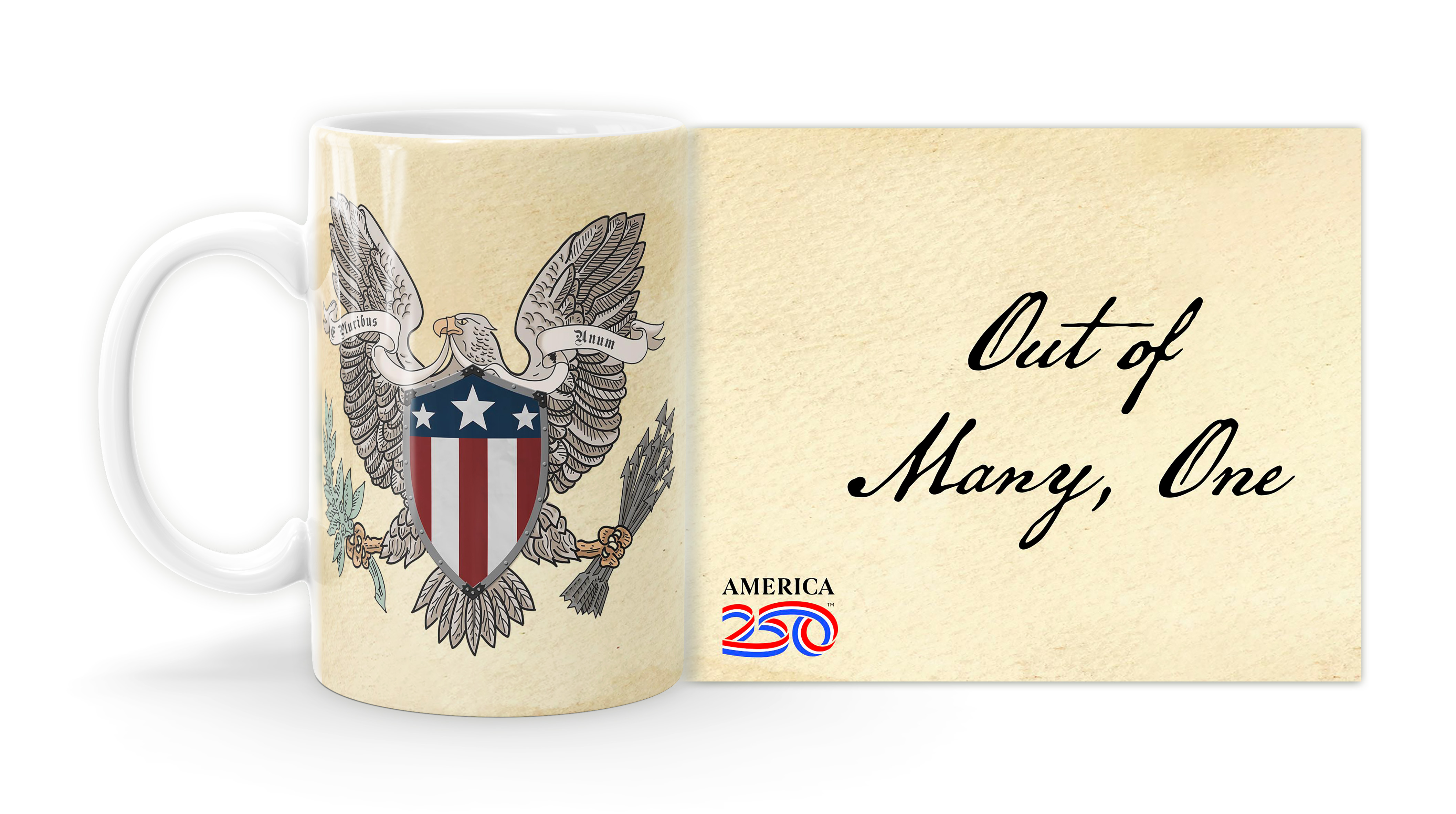 Enjoy your coffee, tea, and hot cocoa in this unique ceramic mug. This 15 oz. high quality coffee mug imprinted in our shops makes a great gift for any event or occasion! This mug features the American Coat of Arms with text that reads "One out of many".  ( MUG15X-AM164 ) The AMERICA 250® word mark and logo are trademarks of the U.S. Semiquincentennial Commission and are used by Nelson Enterprises under license.