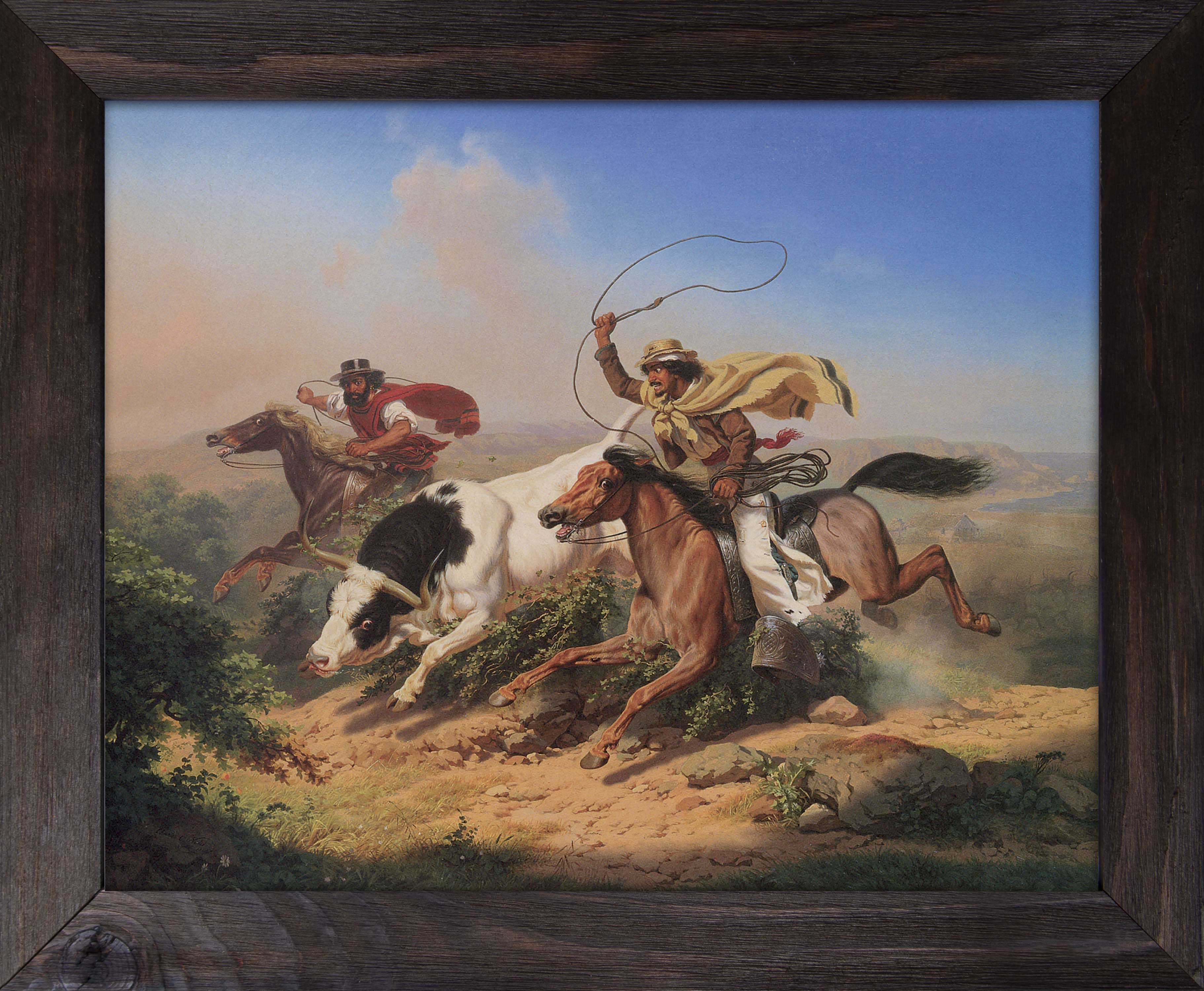 This framed canvas is a printed copy of Charles Christian Nahl's "Vaqueros Roping a Steer"