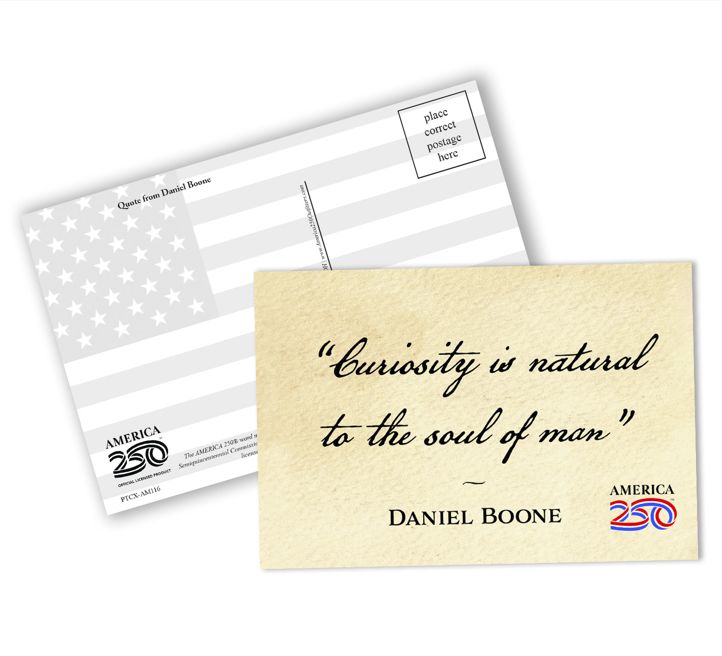 Send a message to friends and family with these Patriotic greeting cards! The front features the quote from Theodore Roosevelt: "Far better it is to dare mighty things, to win glorious triumphs, even though checkered by failure, than to rank with those poor spirits who neither enjoy much nor suffer much, because they live in that grey twilight that knows neither victory nor defeat".  These postcards can be bought as singles, or in a bundle of a dozen.  ( PTC-AM116 ) The AMERICA 250® word mark and logo are trademarks of the U.S. Semiquincentennial Commission and are used by Nelson Enterprises under license.