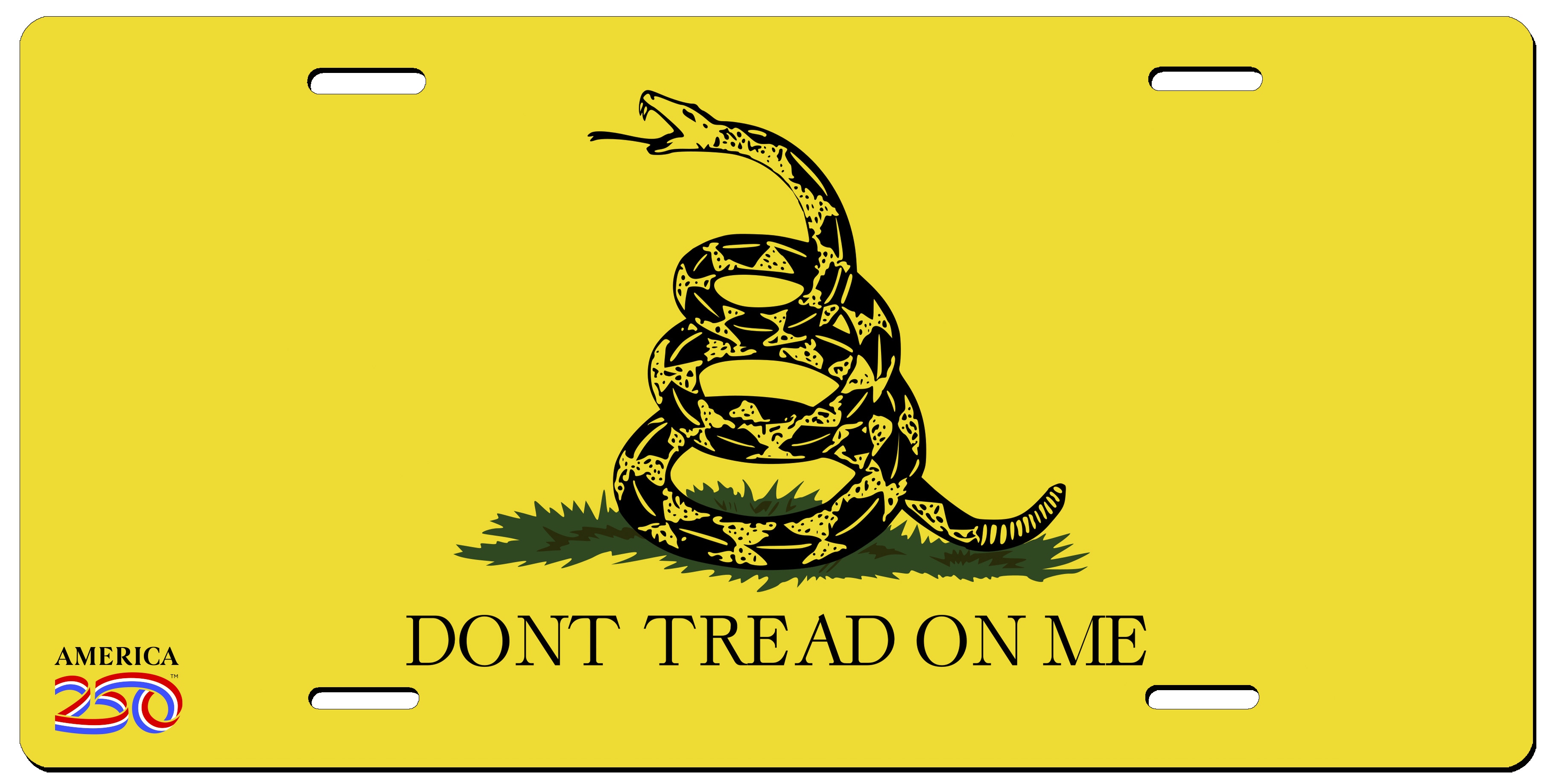 Take your patriotism to the streets, literally, with this unique, attractive license plate! Made in our shops, this high-quality, UV and weather resistant, 6"x12" glossy plate is the perfect addition to any vehicle and makes a wonderful gift! This license plate features the Gadsden flag, which features a snake on a yellow background with text that reads "Don't tread on me" in black text.
