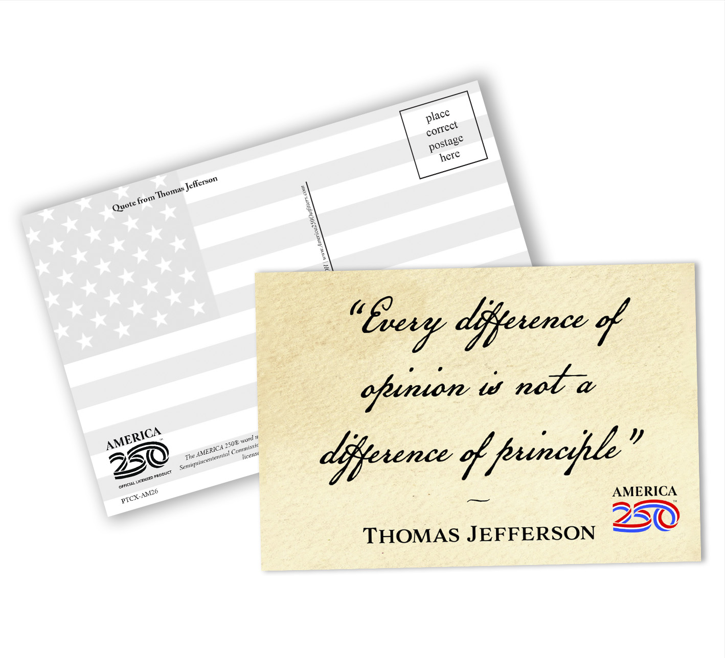 Send a message to friends and family with these Patriotic Postcards! The front features the quote from Thomas Jefferson: "Every difference of opinion is not a difference of principle".  These postcards can be bought as singles, or in a bundle of a dozen.  ( PTC-AM26 ) The AMERICA 250® word mark and logo are trademarks of the U.S. Semiquincentennial Commission and are used by Nelson Enterprises under license.