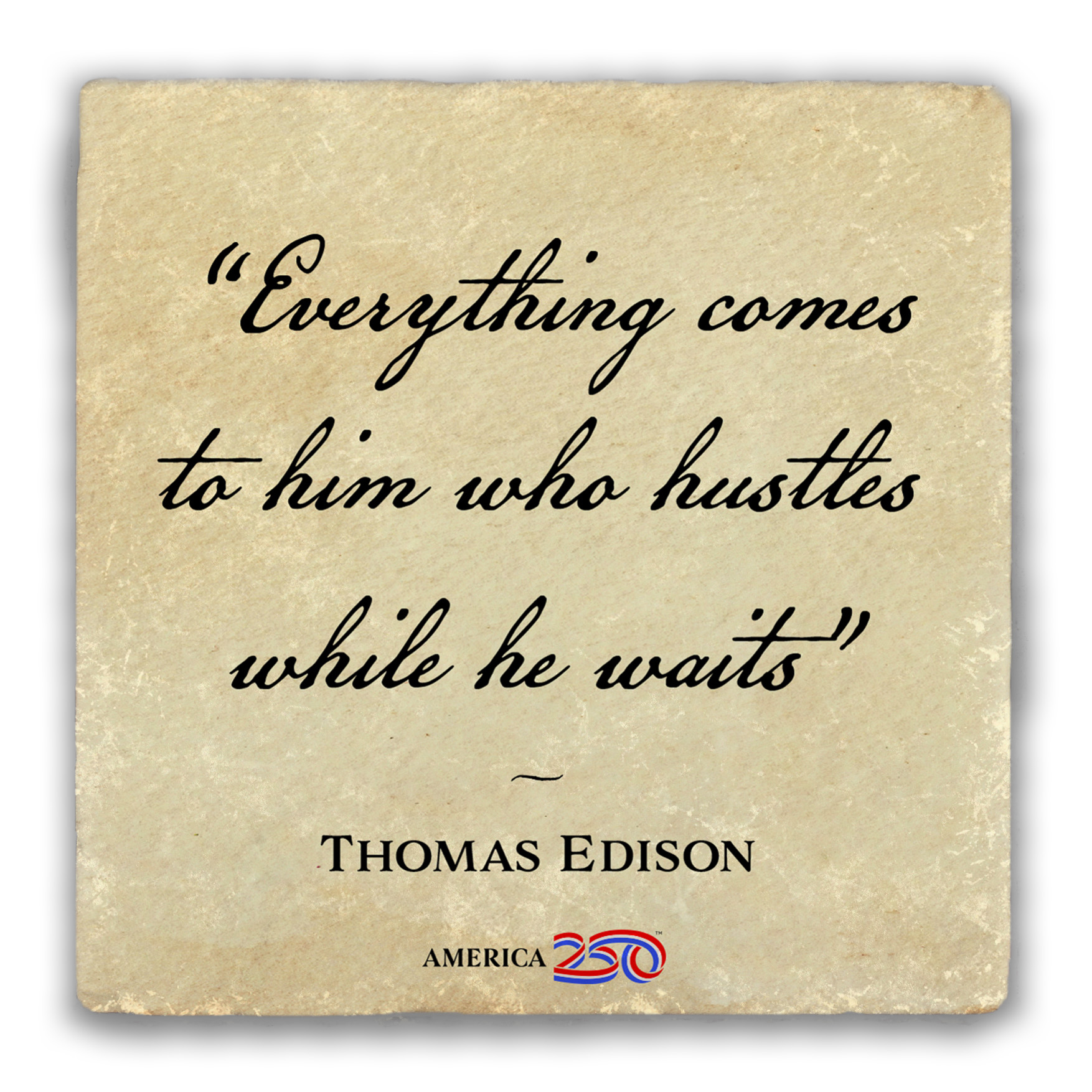 This tumbled stone coaster features the quote from Thomas Edison: "Everything comes to him who hustles while he waits". Save your counter from spills and stains with these patriotic-themed coasters, or buy some as a gift for a friend! Each coaster is 4 in. x 4 in. and stands 1/2 in. high. As these are cut from real rock, the white flecks and edging on each one will be unique. They are easy to clean, and come with a cork bottom to prevent slipping, and heat transfer. You can buy them in singles or packs of 4.
