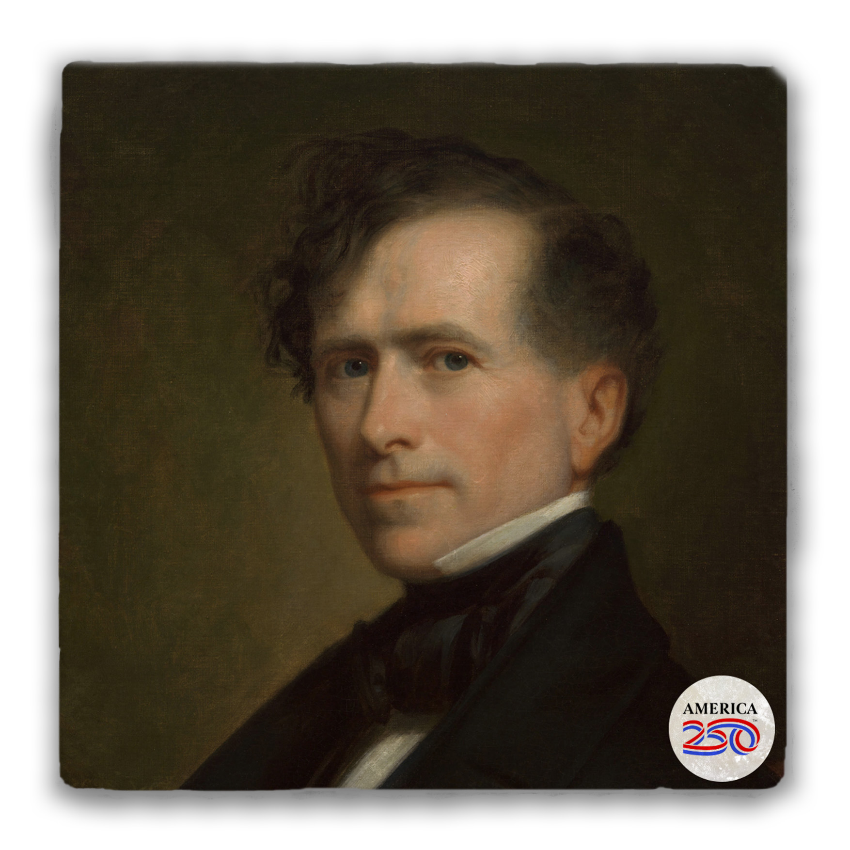 This tumbled stone coaster features the fourteenth president of the United States; Franklin Pierce. Save your counter from spills and stains with these patriotic-themed coasters, or buy some as a gift for a friend! Each coaster is 4 in. x 4 in. and stands 1/2 in. high. As these are cut from real rock, the white flecks and edging on each one will be unique. They are easy to clean, and come with a cork bottom to prevent slipping, and heat transfer. You can buy them in singles or packs of 4. ( COAST2-AM133 ) The AMERICA 250® word mark and logo are trademarks of the U.S. Semiquincentennial Commission and are used by Nelson Enterprises under license.
