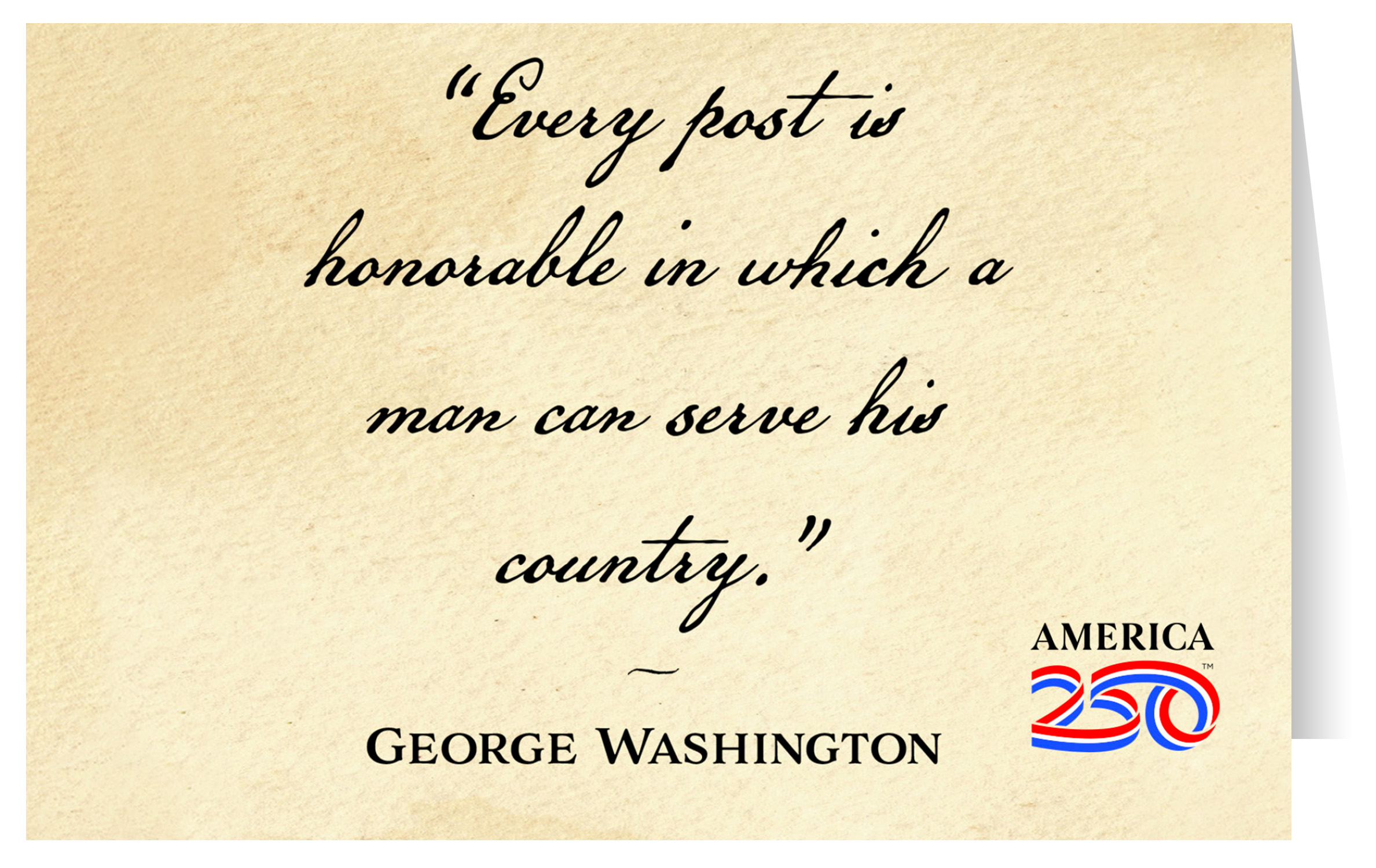 Send thanks, congratulations, greetings, and more to friends and family with these Patriotic greeting cards! The front features the quote from George Washington: "Every post is honorable in which a man can serve his country". The inside is blank. Printed on heavy cardstock, this 4.25"x5.5" card comes with envelopes, and can be bought individually or in bundles of 6.  ( STC-AM32 ) The AMERICA 250® word mark and logo are trademarks of the U.S. Semiquincentennial Commission and are used by Nelson Enterprises under license.