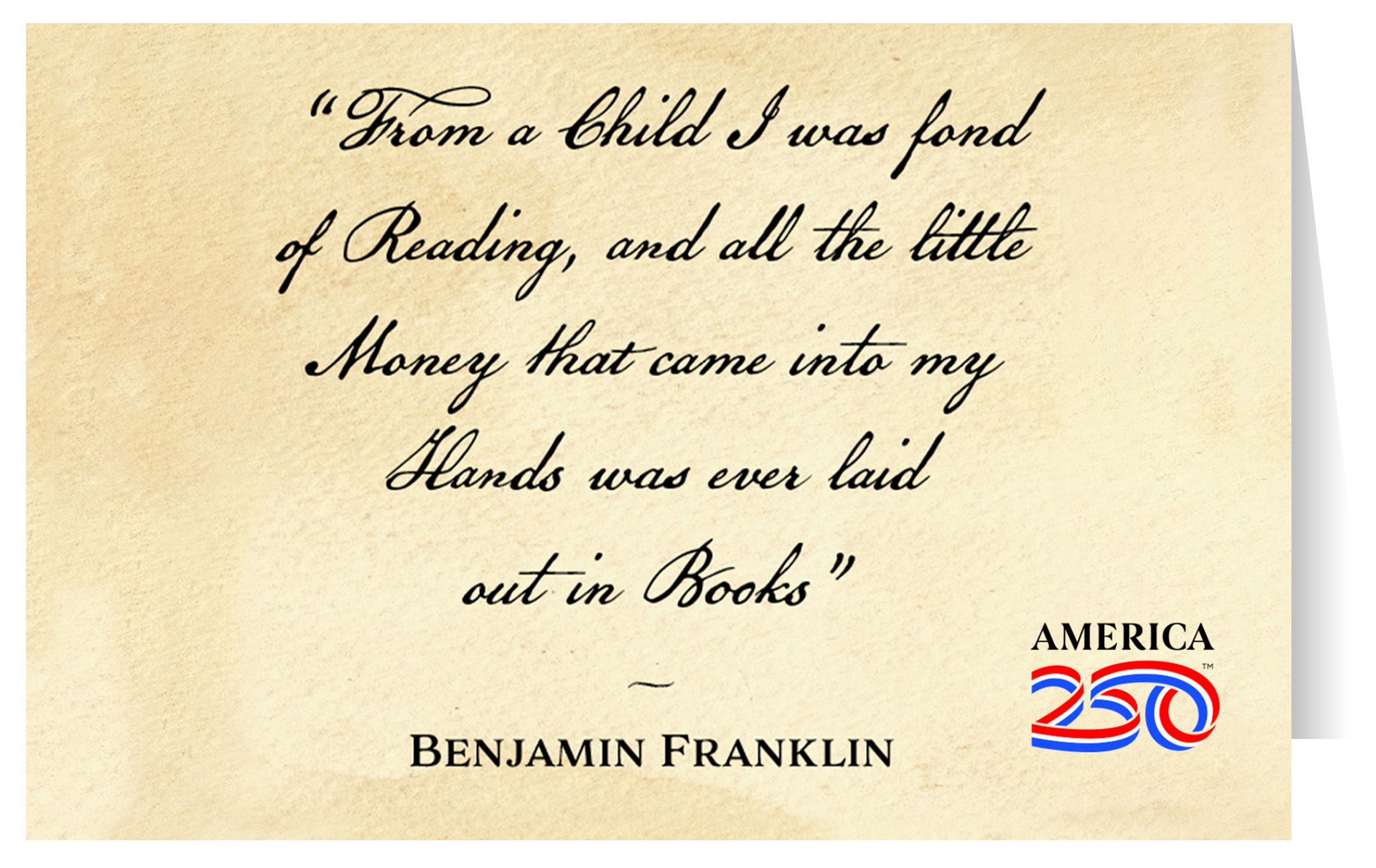 Send thanks, congratulations, greetings, and more to friends and family with these Patriotic greeting cards! from Benjamin Franklin: "From a child I was fond of reading, and all the little money that came into my hands was ever laid out in books". The inside is blank. Printed on heavy cardstock, this 4.25"x5.5" card comes with envelopes, and can be bought individually or in bundles of 6.  ( STC-AM71 ) The AMERICA 250® word mark and logo are trademarks of the U.S. Semiquincentennial Commission and are used by Nelson Enterprises under license.