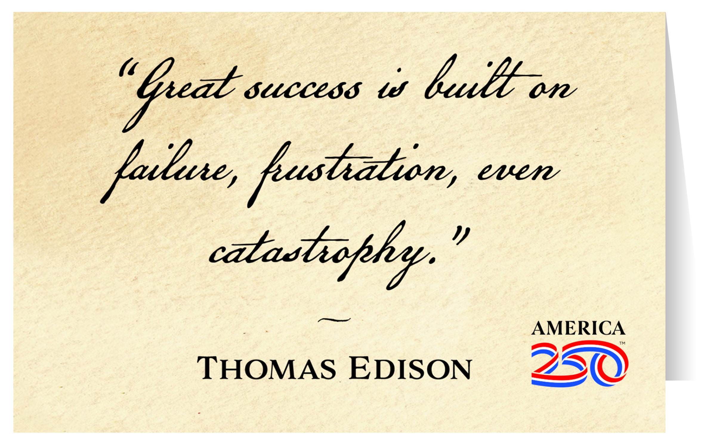 Send thanks, congratulations, greetings, and more to friends and family with these Patriotic greeting cards! The front features the quote from Thomas Edison: "Great success is built on failure, frustration, even catastrophe". The inside is blank. Printed on heavy cardstock, this 4.25"x5.5" card comes with envelopes, and can be bought individually or in bundles of 6.  ( STC-AM94 ) The AMERICA 250® word mark and logo are trademarks of the U.S. Semiquincentennial Commission and are used by Nelson Enterprises under license.