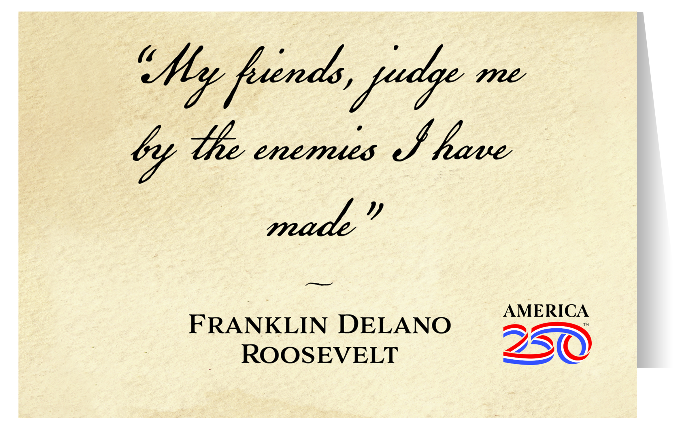 Send thanks, congratulations, greetings, and more to friends and family with these Patriotic greeting cards! The front features the quote from Franklin Delano Roosevelt: "My friends, judge me by the enemies I have made". The inside is blank. Printed on heavy cardstock, this 4.25"x5.5" card comes with envelopes, and can be bought individually or in bundles of 6.  ( STC-AM109 ) The AMERICA 250® word mark and logo are trademarks of the U.S. Semiquincentennial Commission and are used by Nelson Enterprises under license.