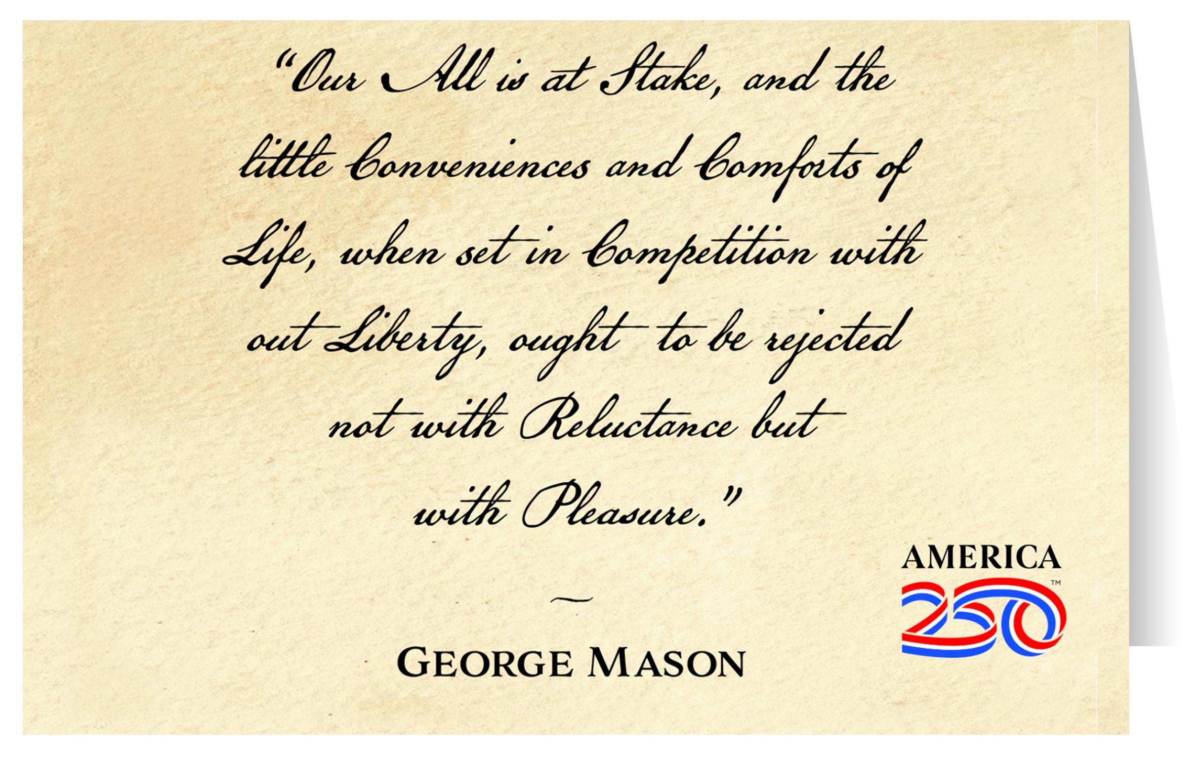 Send thanks, congratulations, greetings, and more to friends and family with these Patriotic greeting cards! The front features from George Mason: "Our All is at stake, and the little conveniences and comforts of life, when set in competition with our liberty, ought to be rejected not with reluctance but with pleasure". The inside is blank. Printed on heavy cardstock, this 4.25"x5.5" card comes with envelopes, and can be bought individually or in bundles of 6.  ( STC-AM56 ) The AMERICA 250® word mark and logo are trademarks of the U.S. Semiquincentennial Commission and are used by Nelson Enterprises under license.