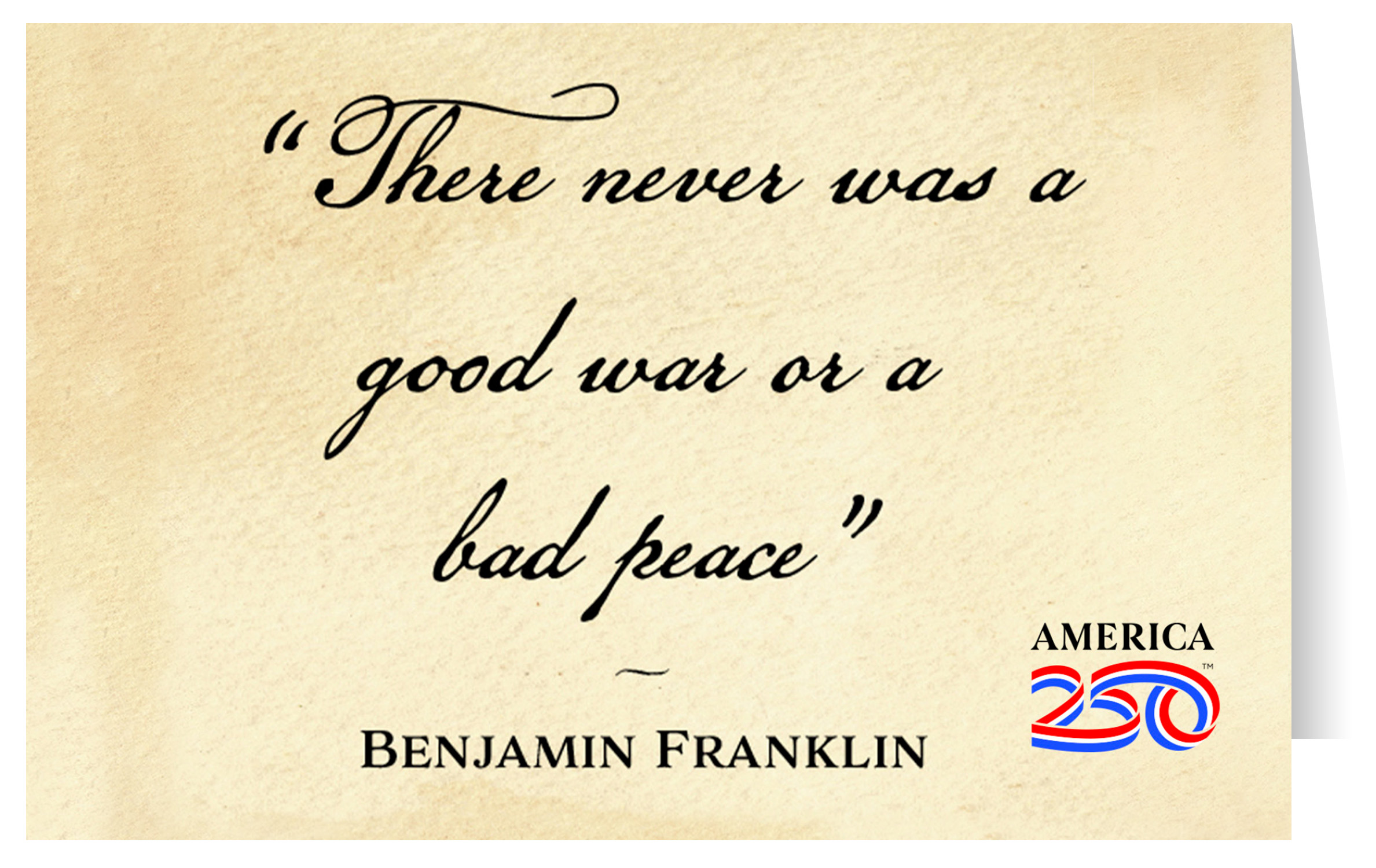 Send thanks, congratulations, greetings, and more to friends and family with these Patriotic greeting cards! The front features the quote from Benjamin Franklin: "There never was a good war or a bad peace". The inside is blank. Printed on heavy cardstock, this 4.25"x5.5" card comes with envelopes, and can be bought individually or in bundles of 6.  ( STC-AM72 ) The AMERICA 250® word mark and logo are trademarks of the U.S. Semiquincentennial Commission and are used by Nelson Enterprises under license.