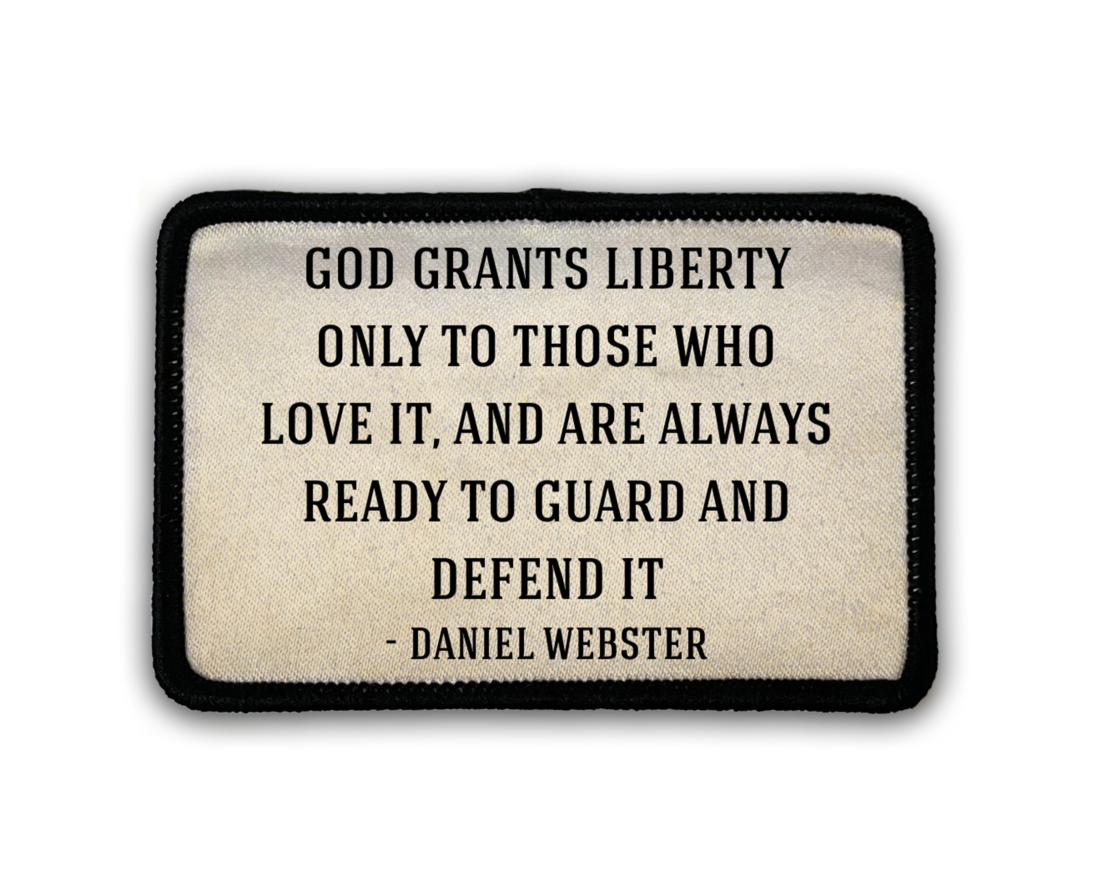 This iron-on patch features text that reads "God grants liberty only to those who love it, and are always ready to guard and defend it - Daniel Webster" in black. Our new iron-on patches are great for a great number of uses, including jackets, backpacks, hats, and more! Smooth, shining polyester combines with our unique printing process to create bold, vibrant colors that stand out in any outfit. This patch is 2.50x1 inches. Comes with instructions for care and application.  (PATCH3-AMERICAN99) The AMERICA 250® word mark and logo are trademarks of the U.S. Semiquincentennial Commission and are used by Nelson Enterprises under license.
