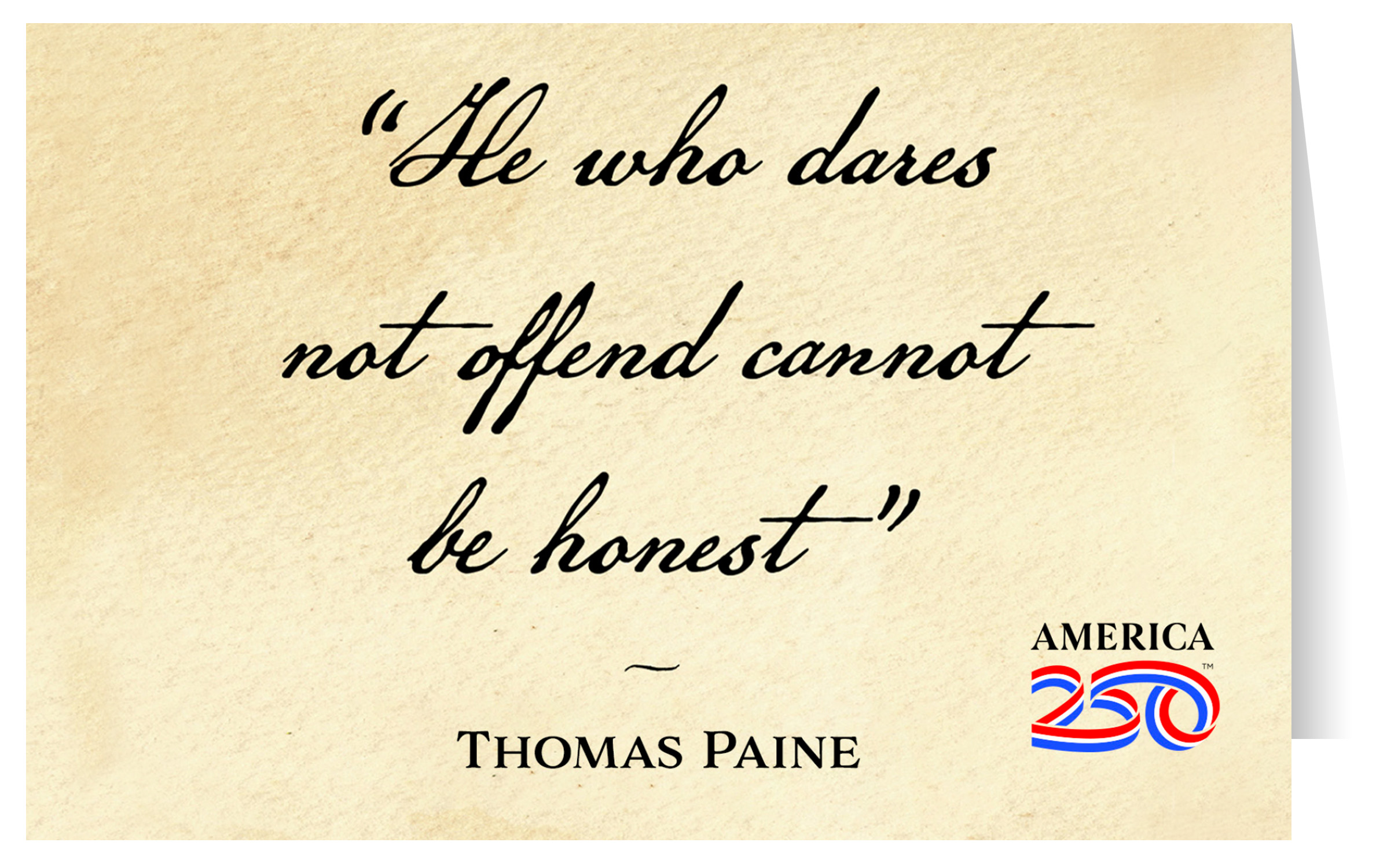 Send thanks, congratulations, greetings, and more to friends and family with these Patriotic Postcards! The front features from Benjamin Franklin: "He who dares not offend cannot be honest". The inside is blank. Printed on heavy cardstock, this 4.25"x5.5" card comes with envelopes, and can be bought individually or in bundles of 6.  ( PTC-AMERICAN46 ) The AMERICA 250® word mark and logo are trademarks of the U.S. Semiquincentennial Commission and are used by Nelson Enterprises under license.