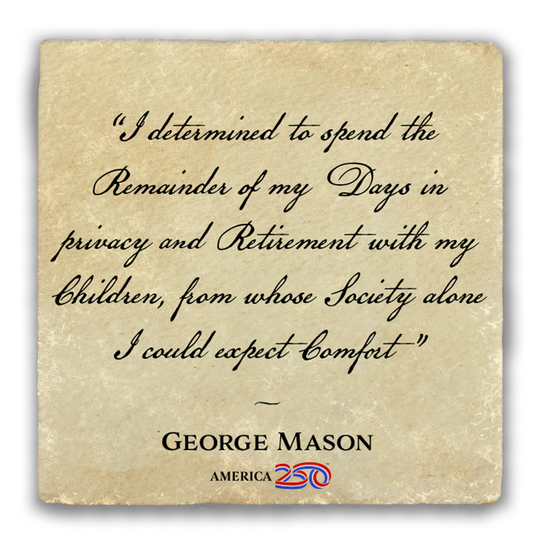 This tumbled stone coaster features the quote from George Mason: "I determined to spend the remainder of my days in privacy and retirement with my children, from whose society alone I could expect comfort". Save your counter from spills and stains with these patriotic-themed coasters, or buy some as a gift for a friend! Each coaster is 4 in. x 4 in. and stands 1/2 in. high. As these are cut from real rock, the white flecks and edging on each one will be unique. They are easy to clean, and come with a cork bottom to prevent slipping, and heat transfer. You can buy them in singles or packs of 4. ( COAST2-AM57 ) The AMERICA 250® word mark and logo are trademarks of the U.S. Semiquincentennial Commission and are used by Nelson Enterprises under license.