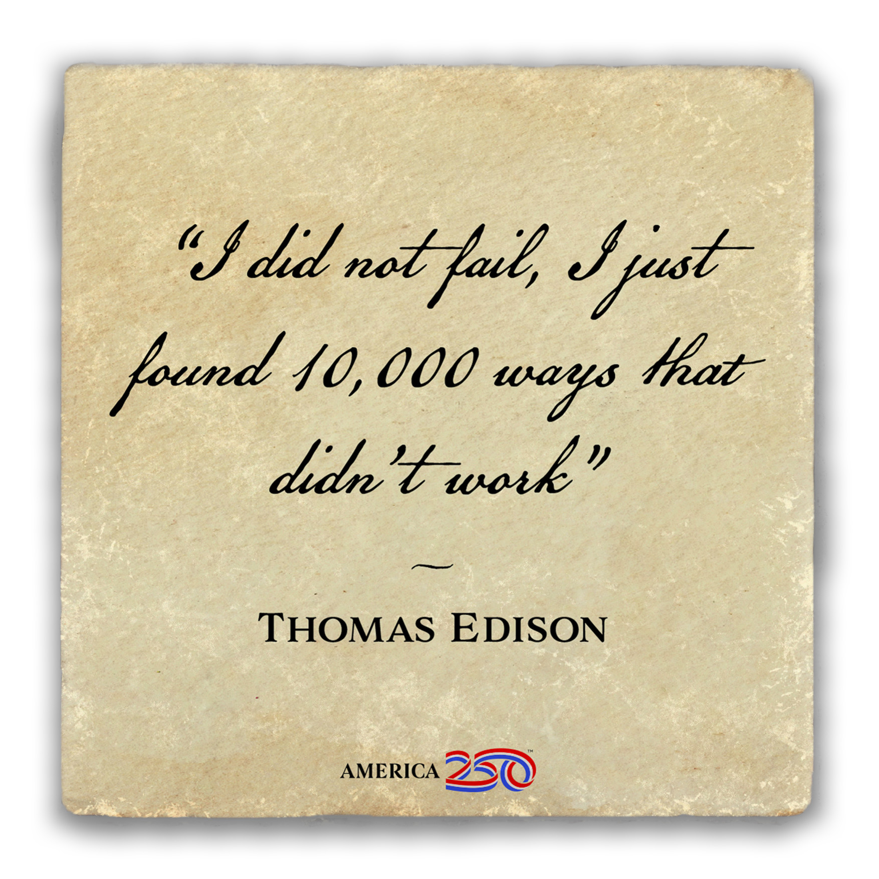 This tumbled stone coaster features the quote from Thomas Edison: "I did not fail, I just found 10,000 ways that didn't work". Save your counter from spills and stains with these wine-themed coasters, or buy some as a gift for a friend! Each coaster is 4 in. x 4 in. and stands 1/2 in. high. As these are cut from real rock, the white flecks and edging on each one will be unique. They are easy to clean, and come with a cork bottom to prevent slipping, and heat transfer. You can buy them in singles or packs of 4. ( COAST2-AM93 ) The AMERICA 250® word mark and logo are trademarks of the U.S. Semiquincentennial Commission and are used by Nelson Enterprises under license.