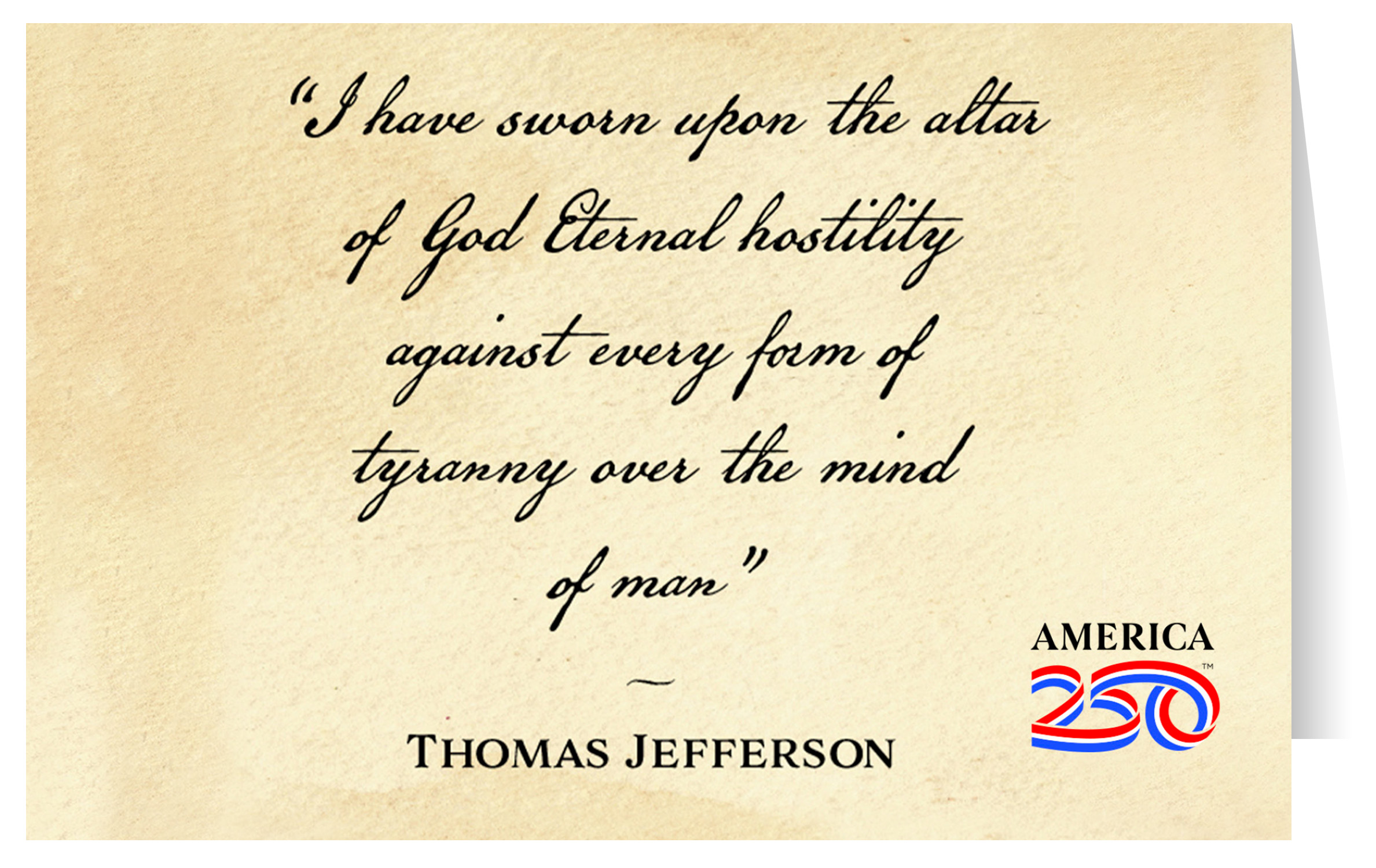 Send thanks, congratulations, greetings, and more to friends and family with these Patriotic Postcards! The front features from Thomas Jefferson: "I have sworn upon the altar of God Eternal hostility against every form of tyranny over the mind of man". The inside is blank. Printed on heavy cardstock, this 4.25"x5.5" card comes with envelopes, and can be bought individually or in bundles of 6.  ( PTC-AMERICAN66 ) The AMERICA 250® word mark and logo are trademarks of the U.S. Semiquincentennial Commission and are used by Nelson Enterprises under license.