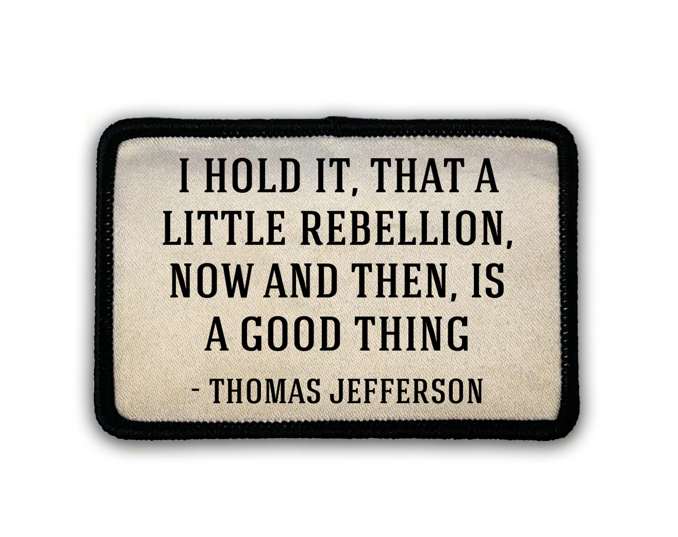 This iron-on patch features text that reads "I hold it, that a little rebellion, now and then, is a good thing - Thomas Jefferson" in black. Our new iron-on patches are great for a great number of uses, including jackets, backpacks, hats, and more! Smooth, shining polyester combines with our unique printing process to create bold, vibrant colors that stand out in any outfit. This patch is 2.50x1 inches. Comes with instructions for care and application.  (PATCH3-AMERICAN24) The AMERICA 250® word mark and logo are trademarks of the U.S. Semiquincentennial Commission and are used by Nelson Enterprises under license.