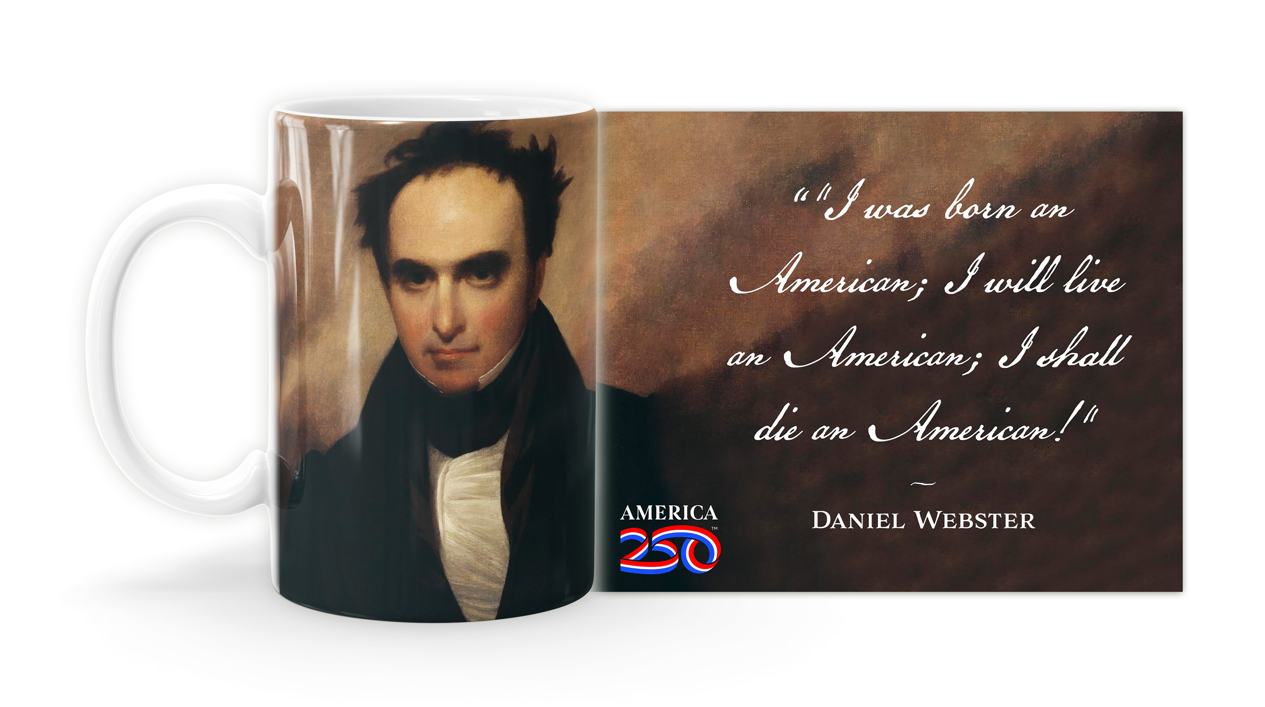 Enjoy your coffee, tea, and hot cocoa in this unique ceramic mug. This 15 oz. high quality coffee mug imprinted in our shops makes a great gift for any event or occasion! This mug features the Daniel WebsterQuote "I was born an American; I will live an American; I shall die an American!"