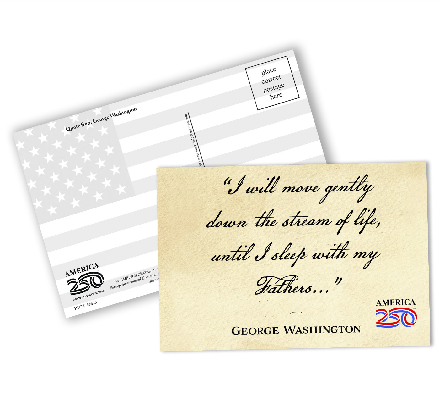 Send a message to friends and family with these Patriotic Postcards! The front features the quote from George Washington: "I will move gently down the stream of life, until I sleep with my Fathers...".  These postcards can be bought as singles, or in a bundle of a dozen.  ( PTC-AM33 ) The AMERICA 250® word mark and logo are trademarks of the U.S. Semiquincentennial Commission and are used by Nelson Enterprises under license.