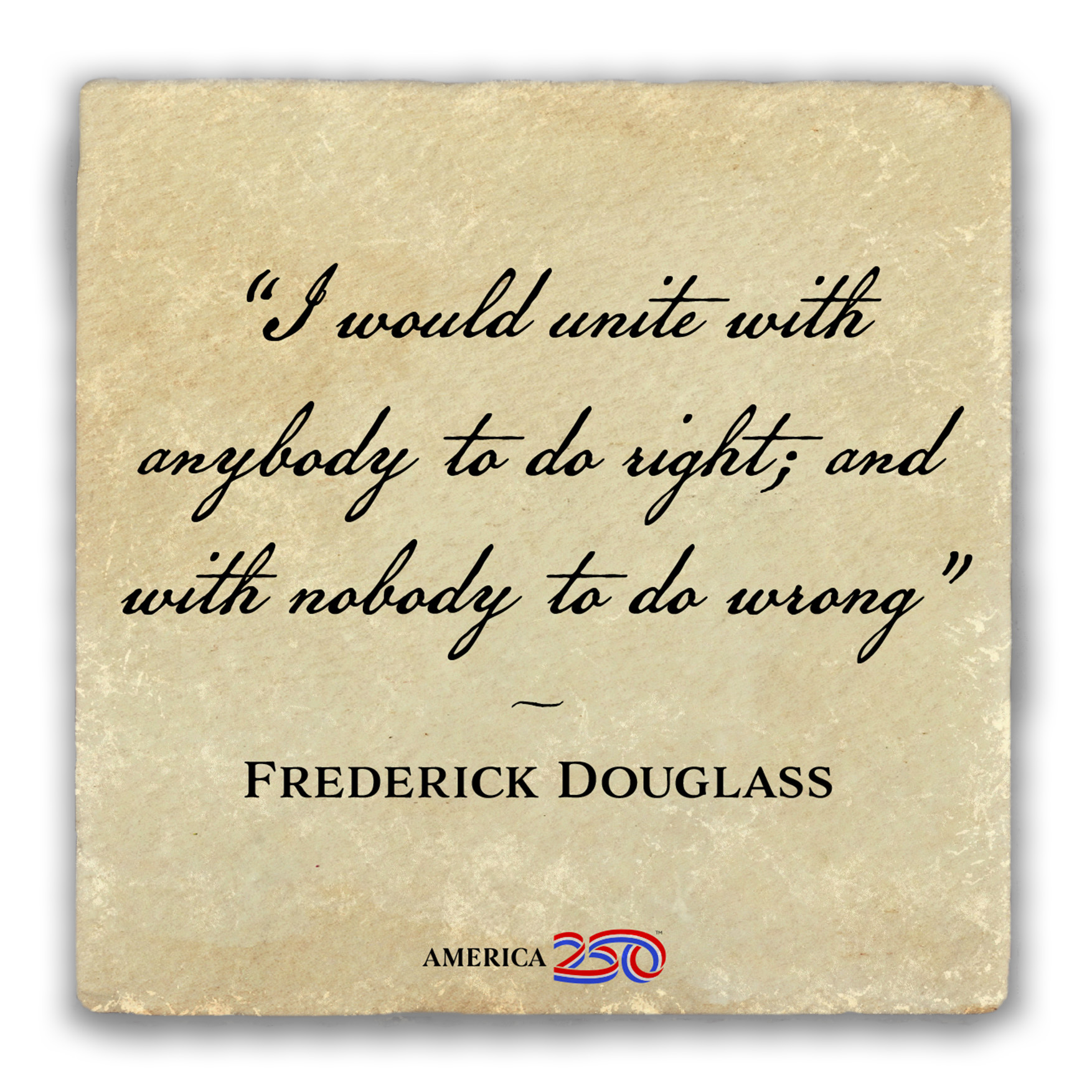 This tumbled stone coaster features the quote from Frederick Douglass: "I would unite with anybody to do right; and with nobody to do wrong". Save your counter from spills and stains with these wine-themed coasters, or buy some as a gift for a friend! Each coaster is 4 in. x 4 in. and stands 1/2 in. high. As these are cut from real rock, the white flecks and edging on each one will be unique. They are easy to clean, and come with a cork bottom to prevent slipping, and heat transfer. You can buy them in singles or packs of 4. ( COAST2-AM86 ) The AMERICA 250® word mark and logo are trademarks of the U.S. Semiquincentennial Commission and are used by Nelson Enterprises under license.
