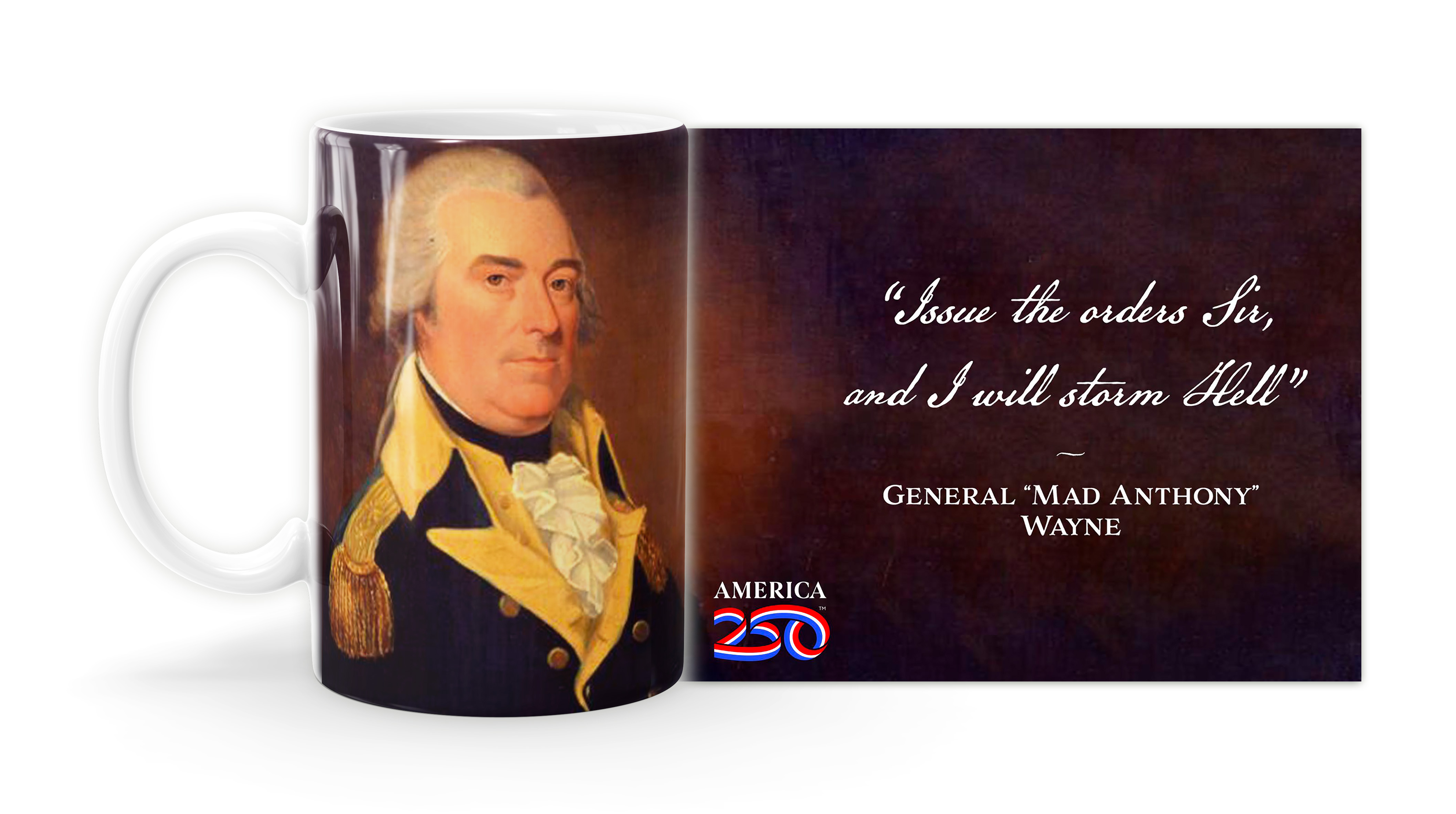 Enjoy your coffee, tea, and hot cocoa in this unique ceramic mug. This 15 oz. high quality coffee mug imprinted in our shops makes a great gift for any event or occasion! This mug features the General “Mad Anthony” WayneQuote "Issue the orders Sir, and I will storm Hell."