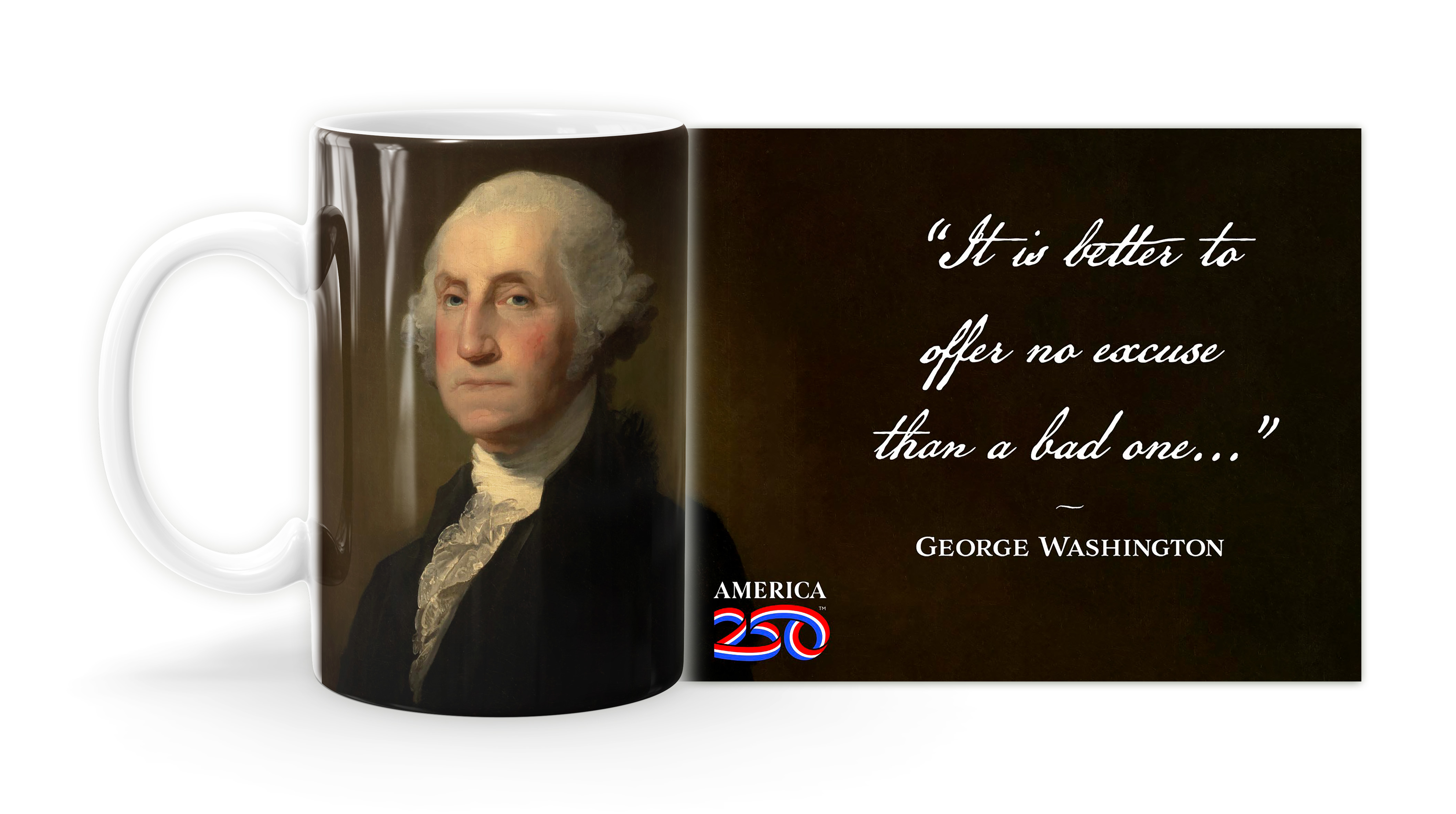 Enjoy your coffee, tea, and hot cocoa in this unique ceramic mug. This 15 oz. high quality coffee mug imprinted in our shops makes a great gift for any event or occasion! This mug features the George Washington Quote "It is better to offer no excuse than a bad one. . ” ( MUG15X-AM07-34 ) The AMERICA 250® word mark and logo are trademarks of the U.S. Semiquincentennial Commission and are used by Nelson Enterprises under license.